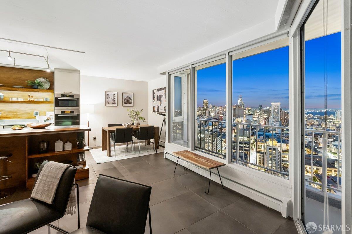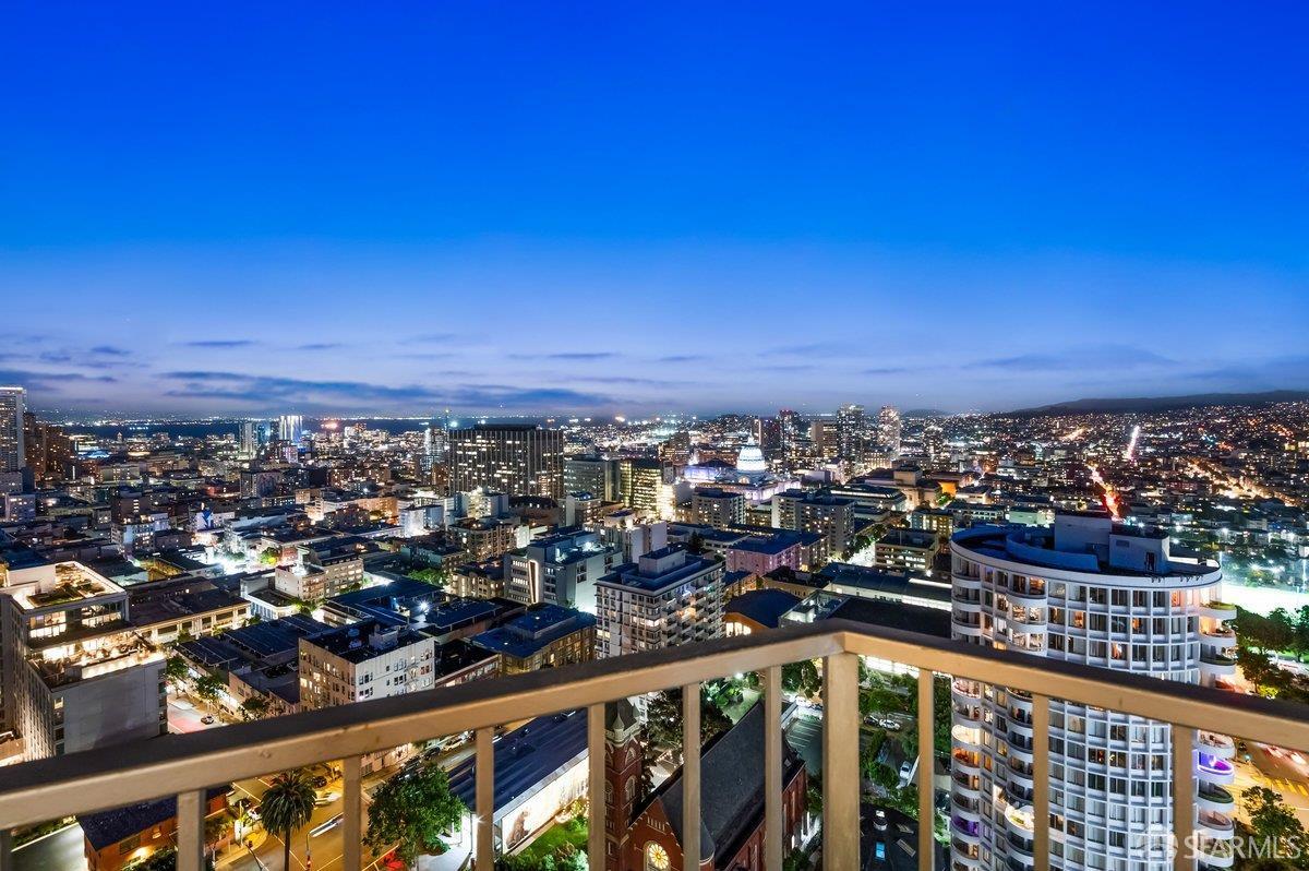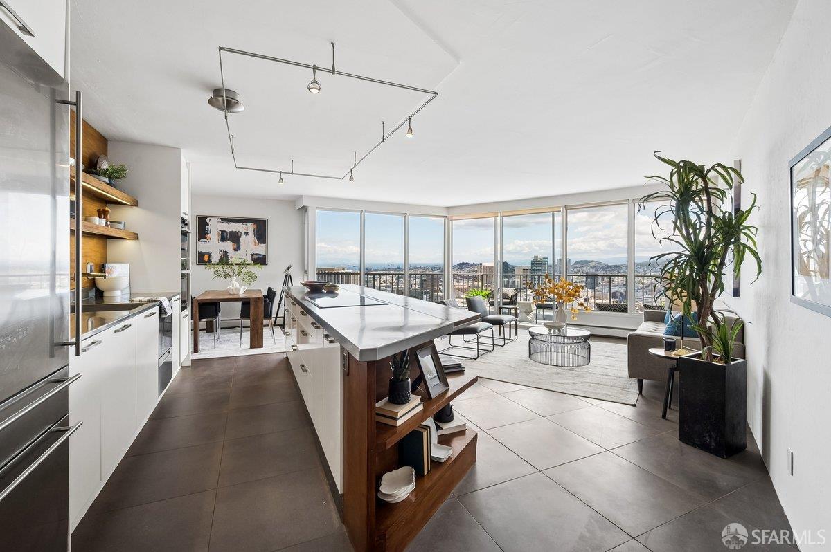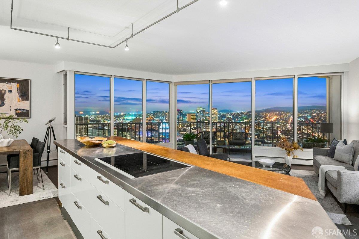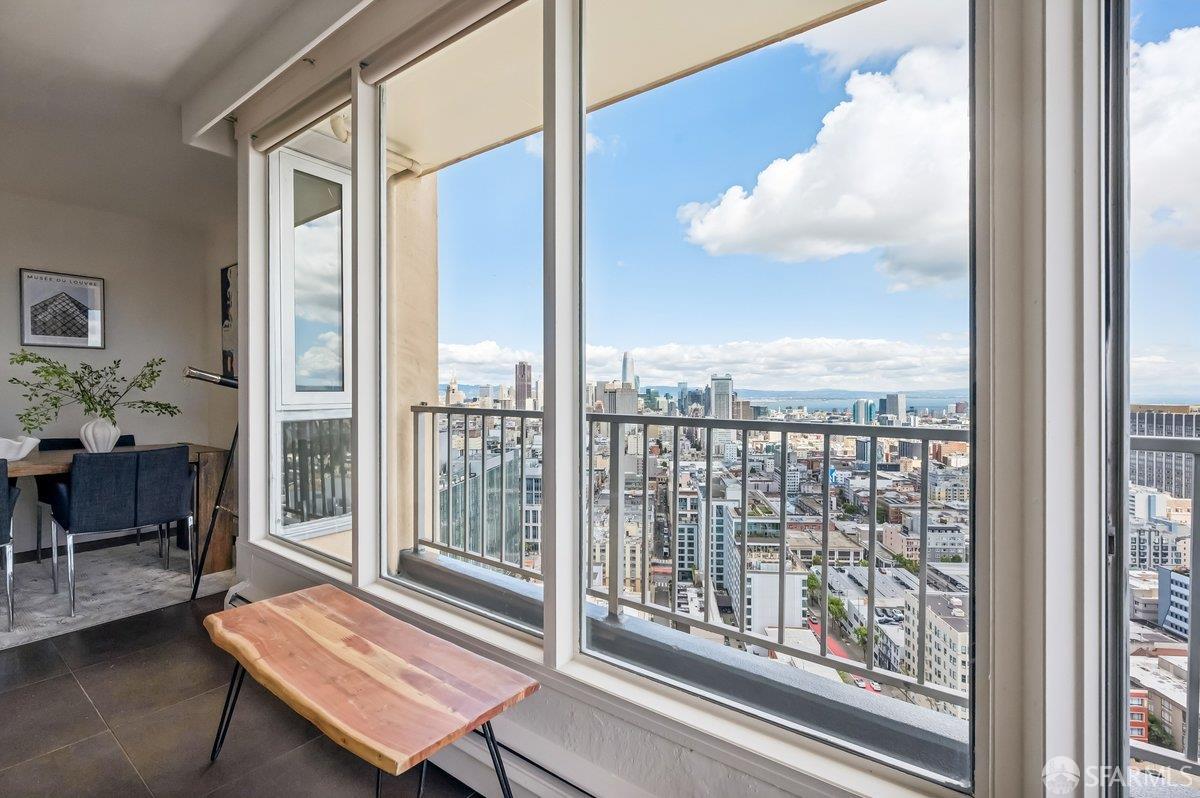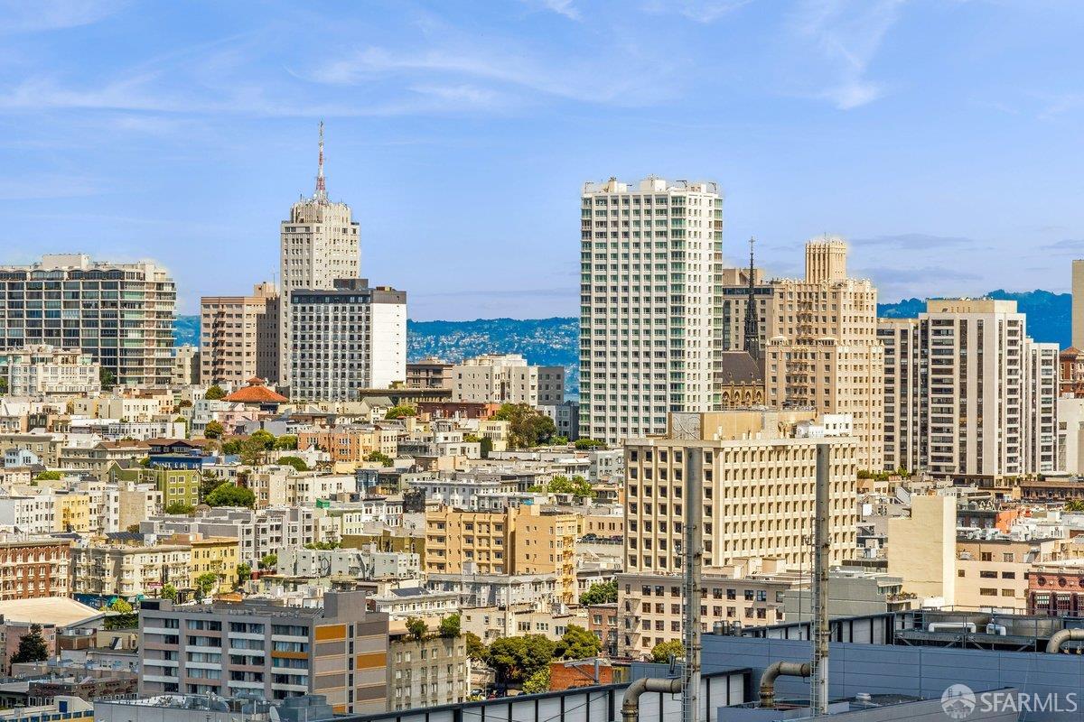 Residence 23D at Cathedral Hill Tower offers sweeping views of the Bay and the downtown skyline, from City Hall to Twin Peaks. Floor-to-ceiling windows fill the home with natural light, while a wraparound balcony provides a seamless indoor-outdoor experience with dramatic city vistas. This spacious one-bedroom, one-bath condo spans approximately 900 square feet - larger than most one-bedroom layouts - featuring an open living and dining area designed for both comfort and entertaining. The updated kitchen showcases a sleek, modern design with stainless steel appliances including Bosch Induction Cooktop and double Miele ovens, a large island with a custom wood-and-steel countertop, and a warm wood-accented backsplash. The generously sized bedroom accommodates a king bed, additional furniture, and workspace, and features multiple closets for ample storage. The updated bathroom includes a modern vanity and a shower over a tub with sliding glass doors. Additional highlights include one-car parking in a secured monitored garage, storage, 24-hour security and concierge, guest parking, shared EV charging, 2 elevators and 2 concrete staircases. Ideally located with a Walk Score of 98 near Hayes Valley, Japantown, and Lower Pacific Heights, with convenient access to transit and major routes.