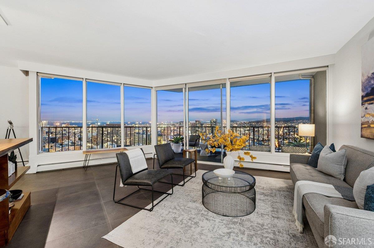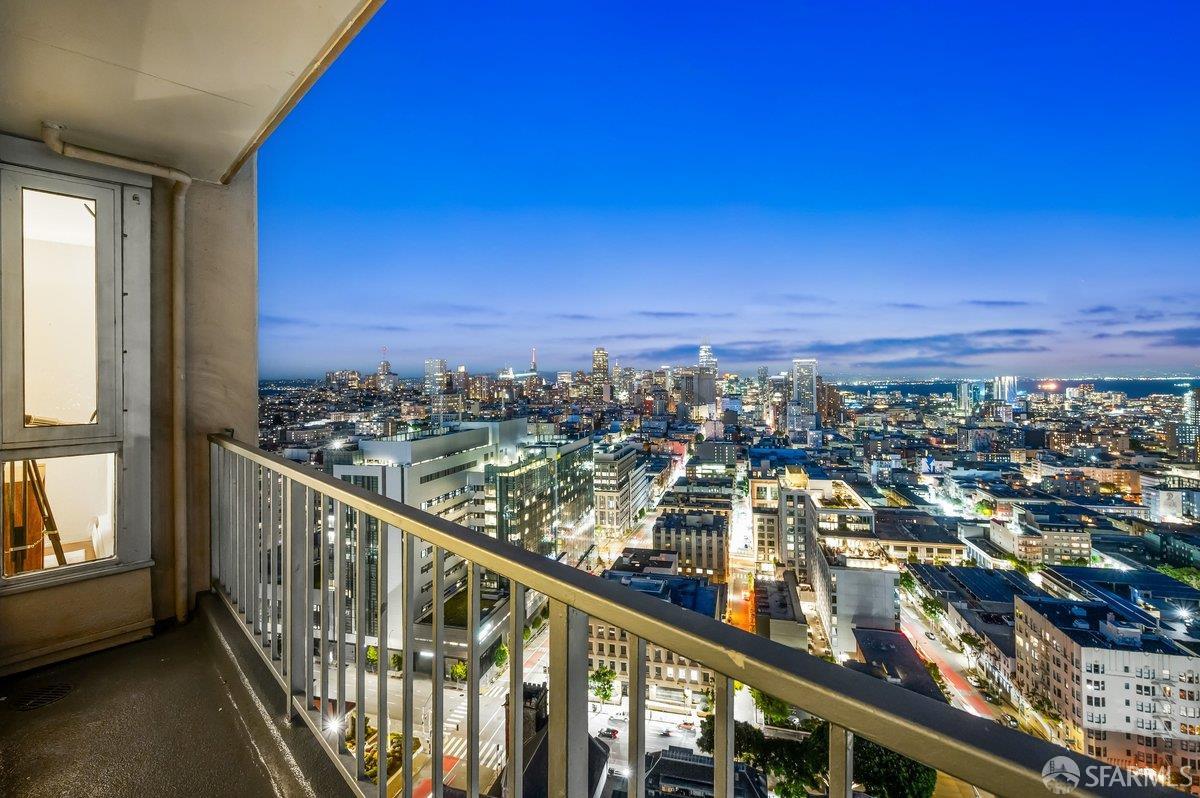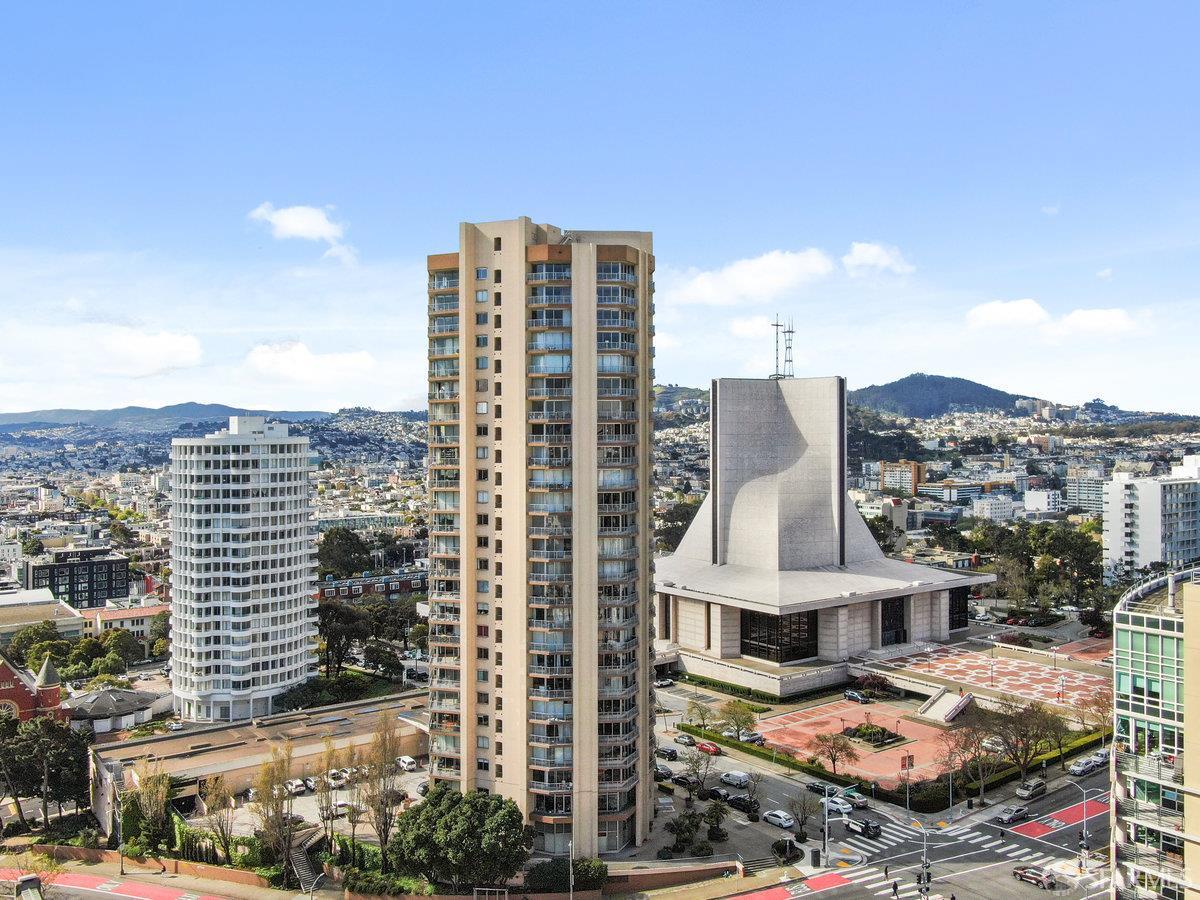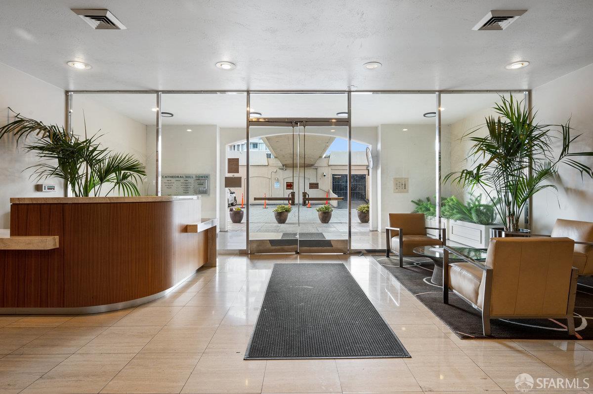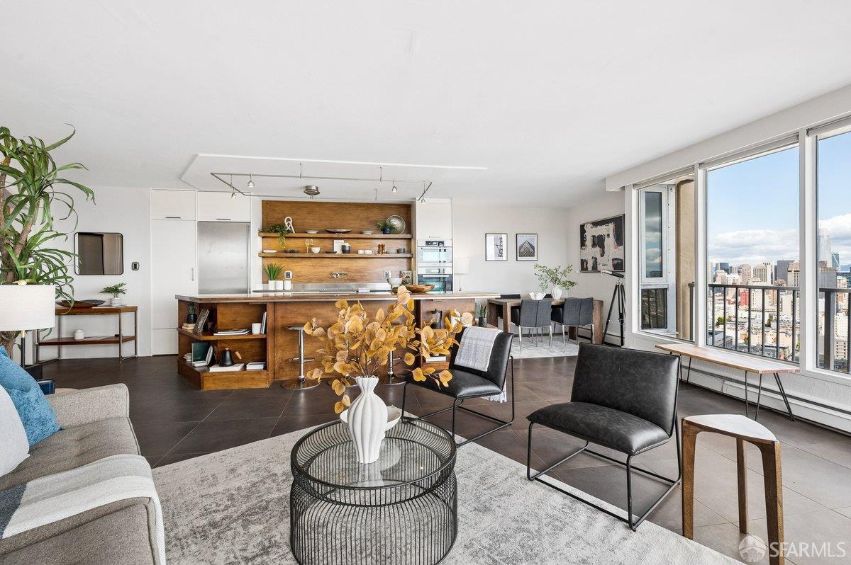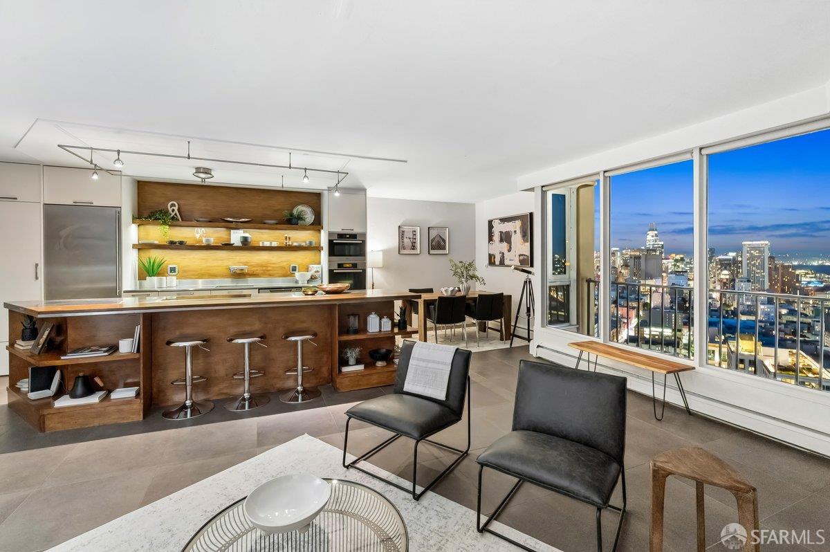 Residence 23D at Cathedral Hill Tower offers sweeping views of the Bay and the downtown skyline, from City Hall to Twin Peaks. Floor-to-ceiling windows fill the home with natural light, while a wraparound balcony provides a seamless indoor-outdoor experience with dramatic city vistas. This spacious one-bedroom, one-bath condo spans approximately 900 square feet - larger than most one-bedroom layouts - featuring an open living and dining area designed for both comfort and entertaining. The updated kitchen showcases a sleek, modern design with stainless steel appliances including Bosch Induction Cooktop and double Miele ovens, a large island with a custom wood-and-steel countertop, and a warm wood-accented backsplash. The generously sized bedroom accommodates a king bed, additional furniture, and workspace, and features multiple closets for ample storage. The updated bathroom includes a modern vanity and a shower over a tub with sliding glass doors. Additional highlights include one-car parking in a secured monitored garage, storage, 24-hour security and concierge, guest parking, shared EV charging, 2 elevators and 2 concrete staircases. Ideally located with a Walk Score of 98 near Hayes Valley, Japantown, and Lower Pacific Heights, with convenient access to transit and major routes.