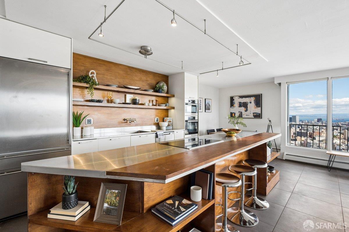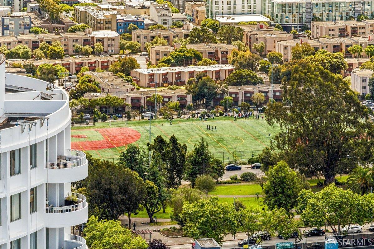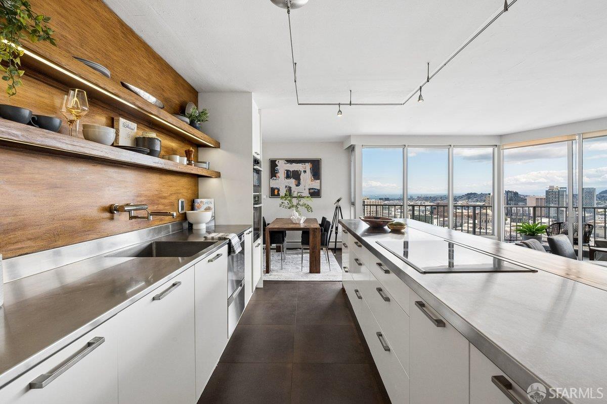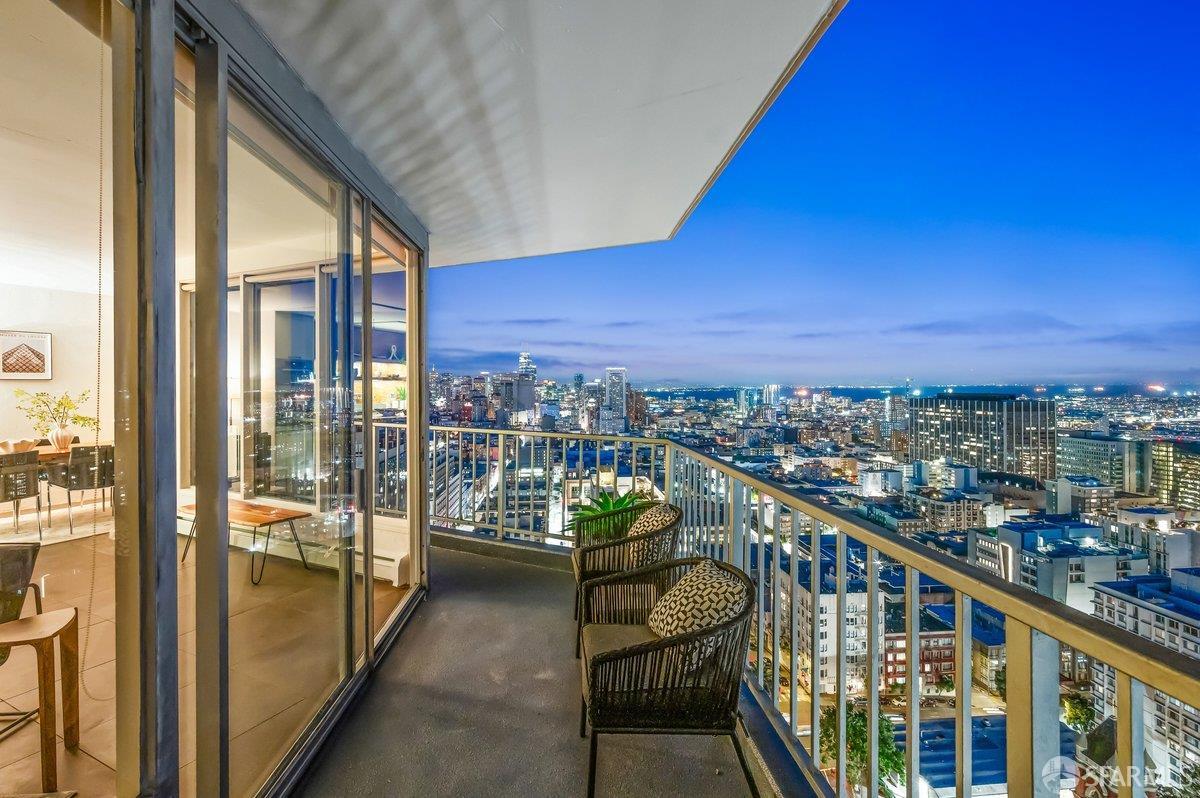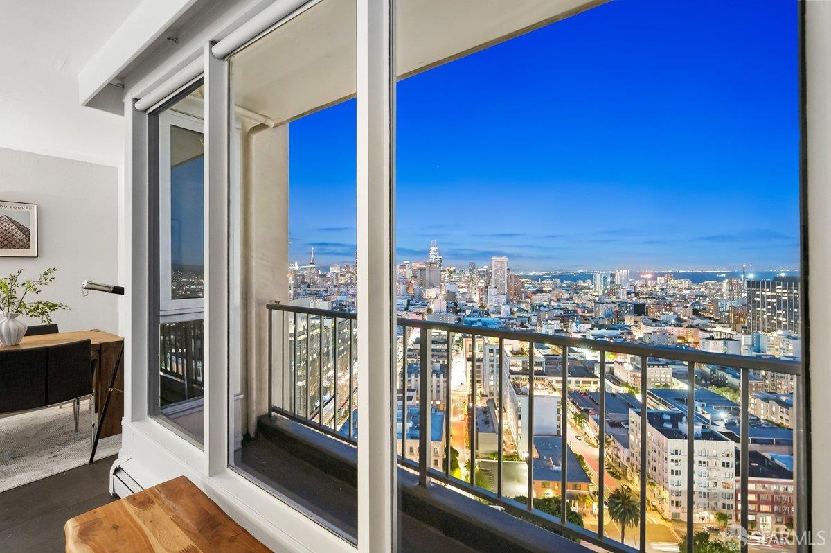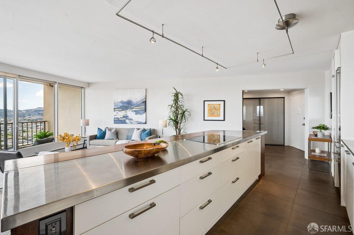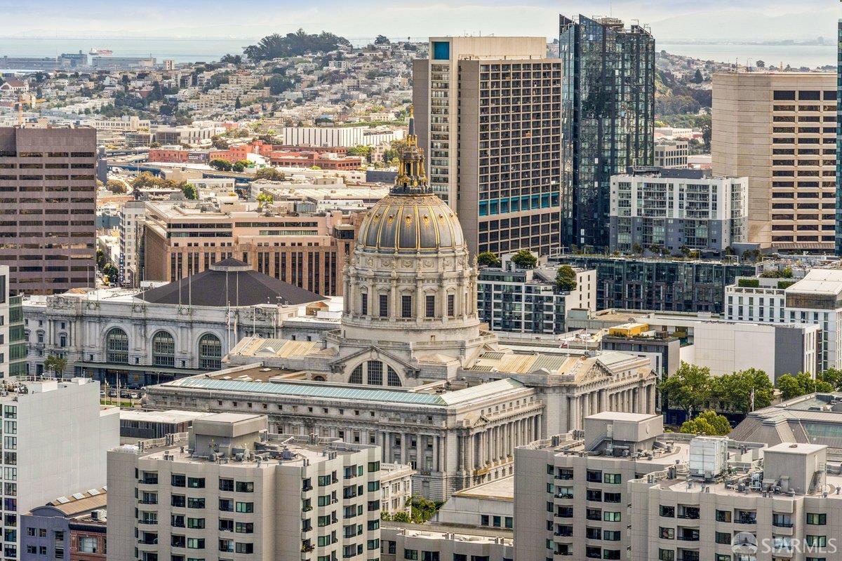 Residence 23D at Cathedral Hill Tower offers sweeping views of the Bay and the downtown skyline, from City Hall to Twin Peaks. Floor-to-ceiling windows fill the home with natural light, while a wraparound balcony provides a seamless indoor-outdoor experience with dramatic city vistas. This spacious one-bedroom, one-bath condo spans approximately 900 square feet - larger than most one-bedroom layouts - featuring an open living and dining area designed for both comfort and entertaining. The updated kitchen showcases a sleek, modern design with stainless steel appliances including Bosch Induction Cooktop and double Miele ovens, a large island with a custom wood-and-steel countertop, and a warm wood-accented backsplash. The generously sized bedroom accommodates a king bed, additional furniture, and workspace, and features multiple closets for ample storage. The updated bathroom includes a modern vanity and a shower over a tub with sliding glass doors. Additional highlights include one-car parking in a secured monitored garage, storage, 24-hour security and concierge, guest parking, shared EV charging, 2 elevators and 2 concrete staircases. Ideally located with a Walk Score of 98 near Hayes Valley, Japantown, and Lower Pacific Heights, with convenient access to transit and major routes.