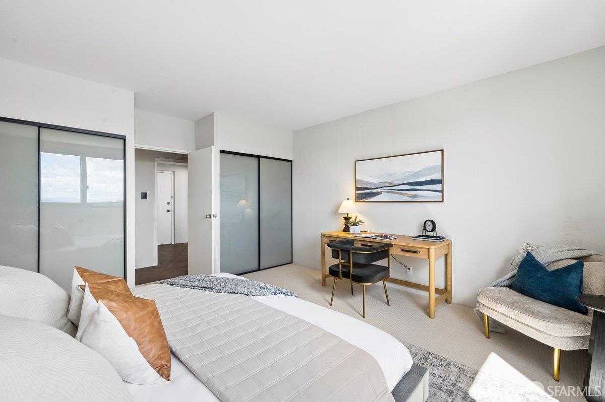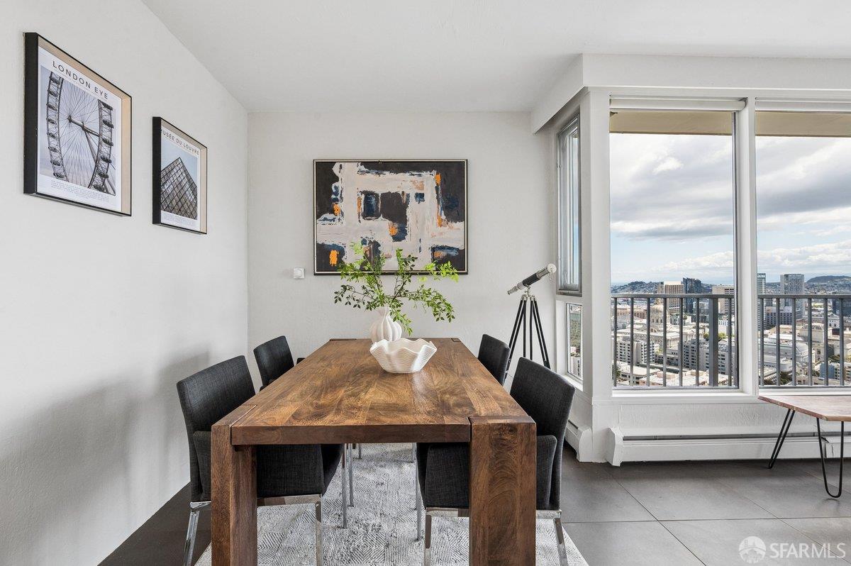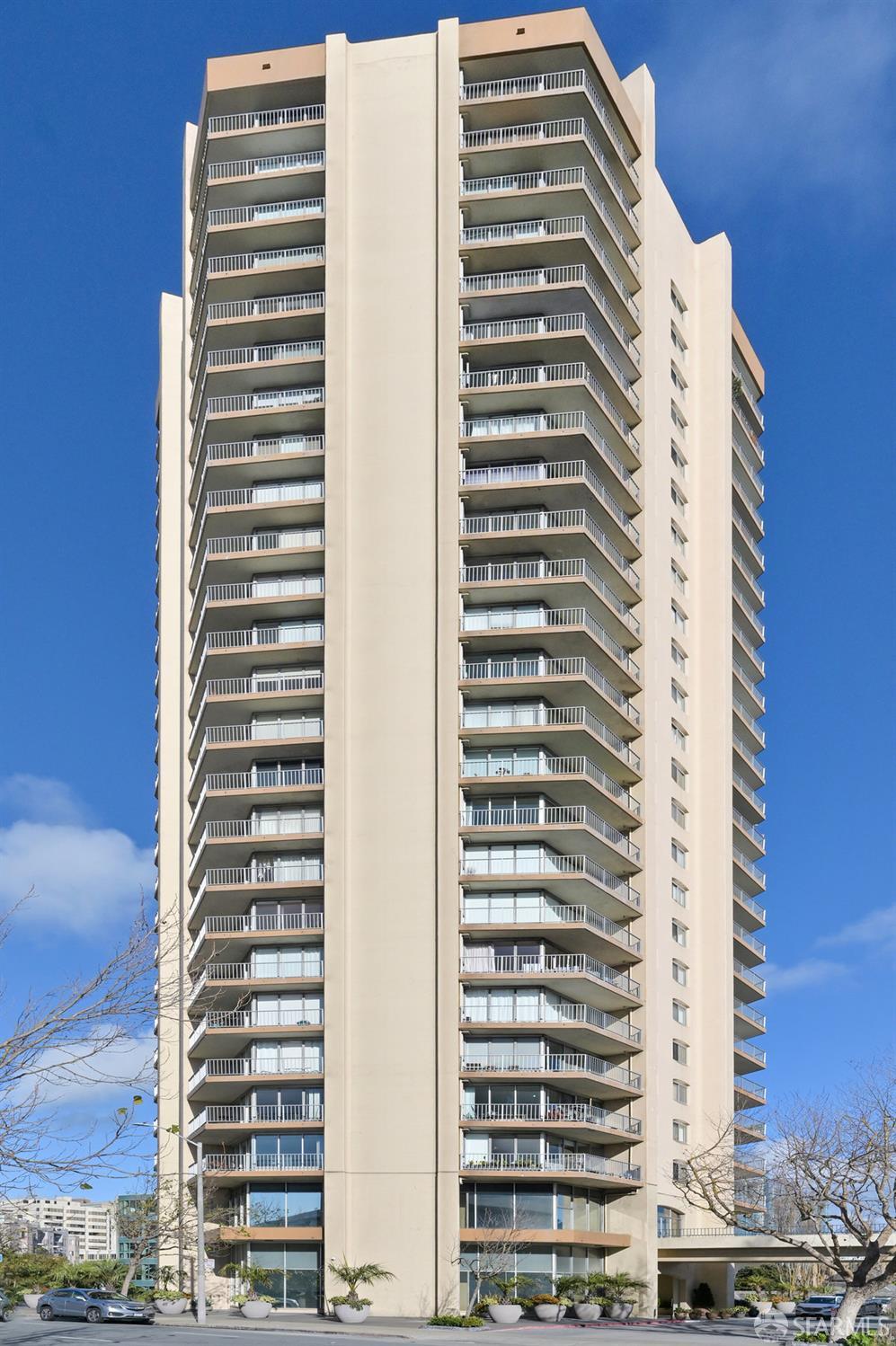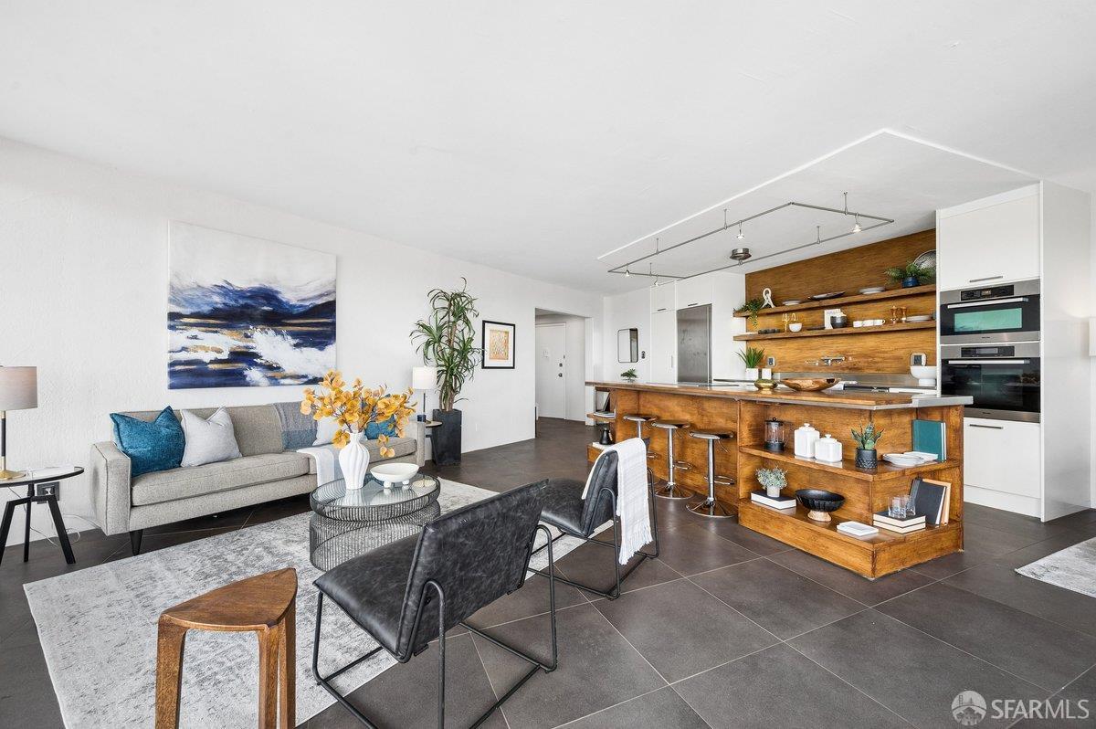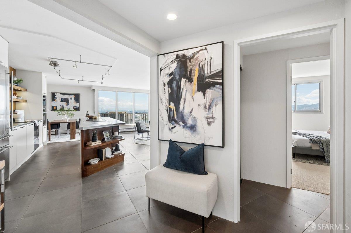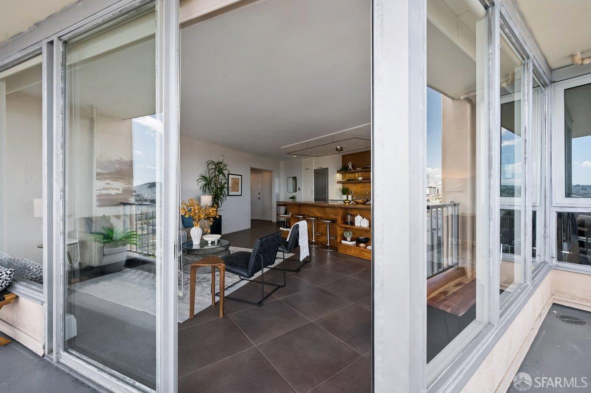 Residence 23D at Cathedral Hill Tower offers sweeping views of the Bay and the downtown skyline, from City Hall to Twin Peaks. Floor-to-ceiling windows fill the home with natural light, while a wraparound balcony provides a seamless indoor-outdoor experience with dramatic city vistas. This spacious one-bedroom, one-bath condo spans approximately 900 square feet - larger than most one-bedroom layouts - featuring an open living and dining area designed for both comfort and entertaining. The updated kitchen showcases a sleek, modern design with stainless steel appliances including Bosch Induction Cooktop and double Miele ovens, a large island with a custom wood-and-steel countertop, and a warm wood-accented backsplash. The generously sized bedroom accommodates a king bed, additional furniture, and workspace, and features multiple closets for ample storage. The updated bathroom includes a modern vanity and a shower over a tub with sliding glass doors. Additional highlights include one-car parking in a secured monitored garage, storage, 24-hour security and concierge, guest parking, shared EV charging, 2 elevators and 2 concrete staircases. Ideally located with a Walk Score of 98 near Hayes Valley, Japantown, and Lower Pacific Heights, with convenient access to transit and major routes.