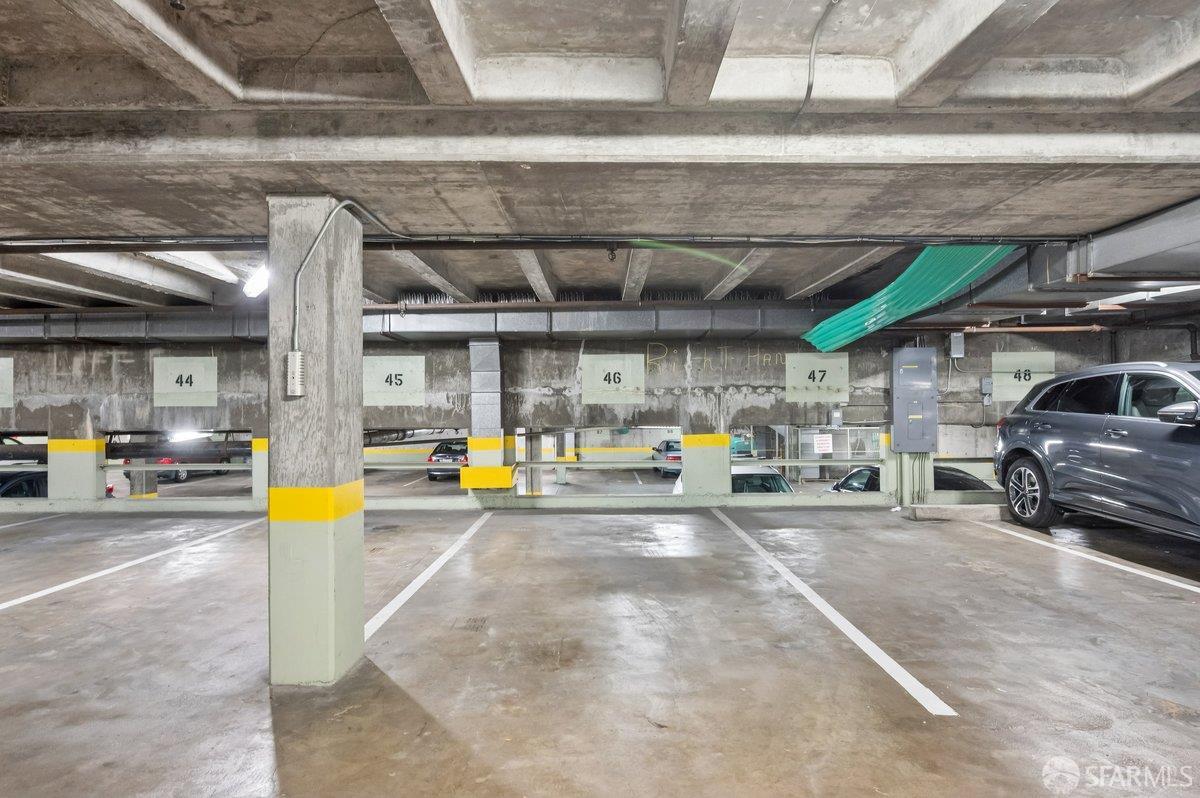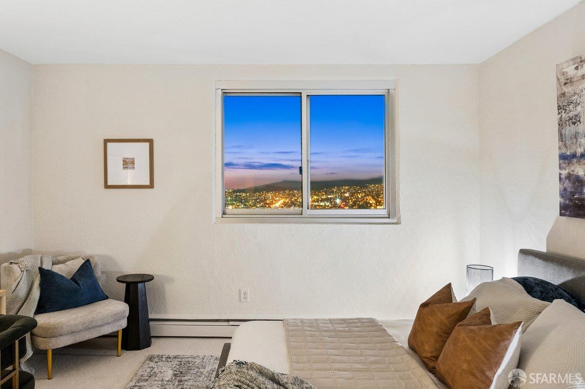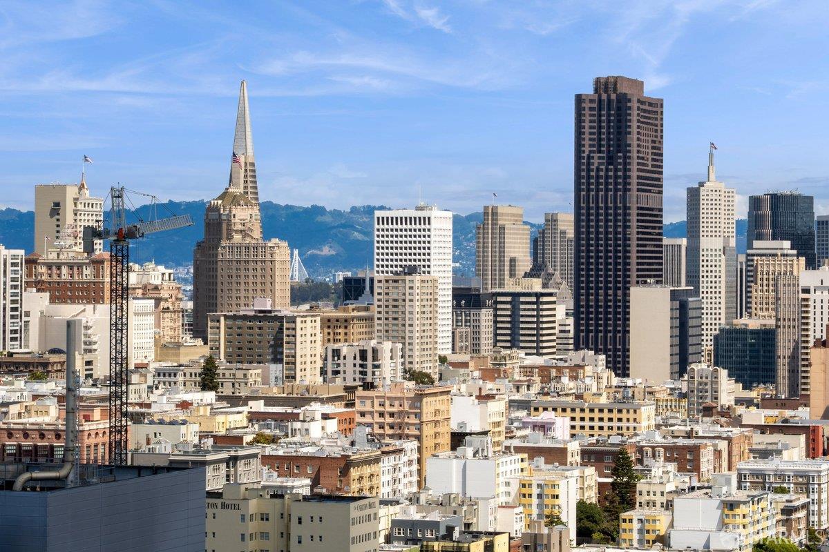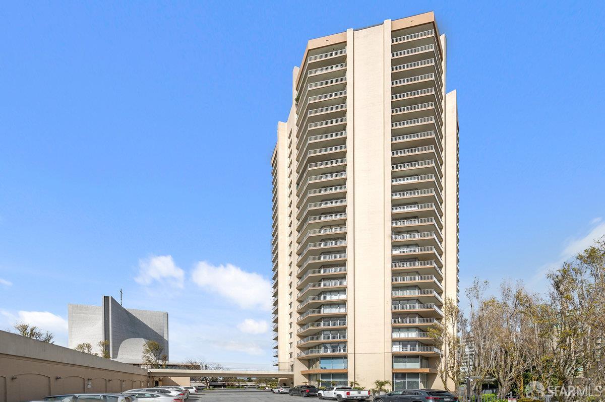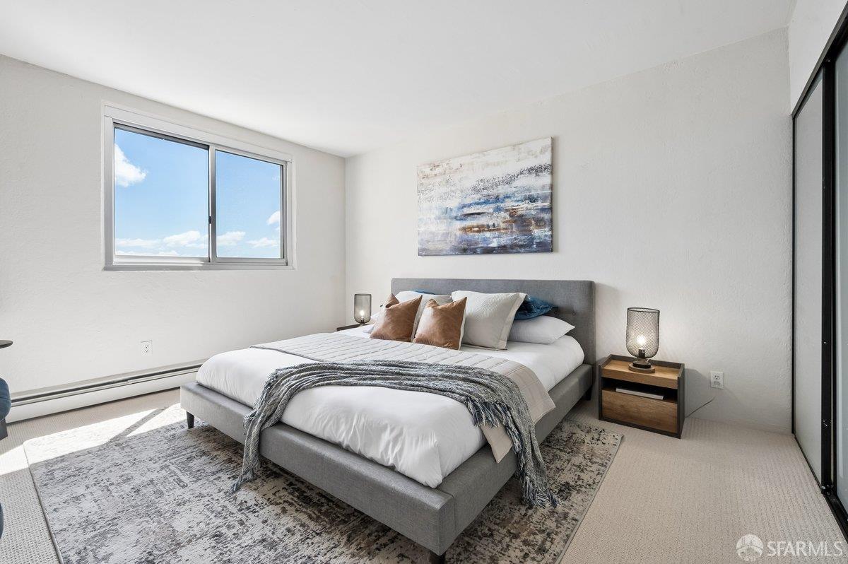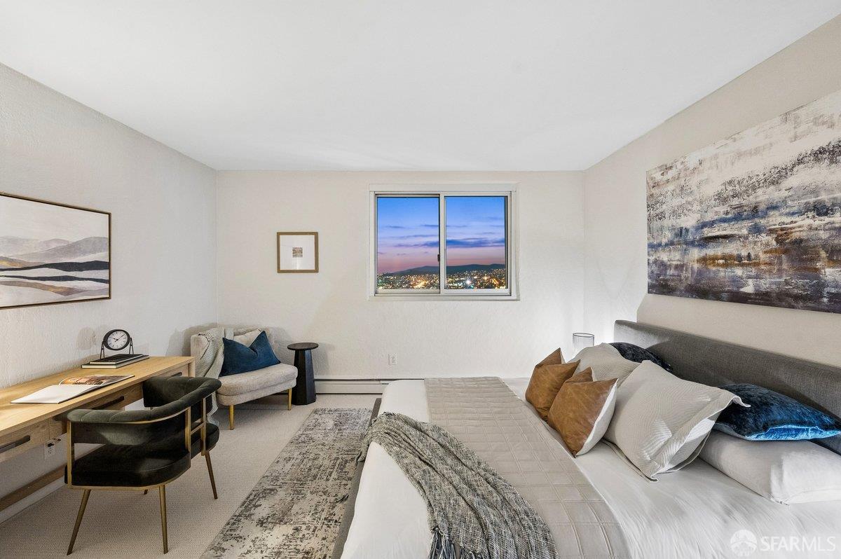 Residence 23D at Cathedral Hill Tower offers sweeping views of the Bay and the downtown skyline, from City Hall to Twin Peaks. Floor-to-ceiling windows fill the home with natural light, while a wraparound balcony provides a seamless indoor-outdoor experience with dramatic city vistas. This spacious one-bedroom, one-bath condo spans approximately 900 square feet - larger than most one-bedroom layouts - featuring an open living and dining area designed for both comfort and entertaining. The updated kitchen showcases a sleek, modern design with stainless steel appliances including Bosch Induction Cooktop and double Miele ovens, a large island with a custom wood-and-steel countertop, and a warm wood-accented backsplash. The generously sized bedroom accommodates a king bed, additional furniture, and workspace, and features multiple closets for ample storage. The updated bathroom includes a modern vanity and a shower over a tub with sliding glass doors. Additional highlights include one-car parking in a secured monitored garage, storage, 24-hour security and concierge, guest parking, shared EV charging, 2 elevators and 2 concrete staircases. Ideally located with a Walk Score of 98 near Hayes Valley, Japantown, and Lower Pacific Heights, with convenient access to transit and major routes.