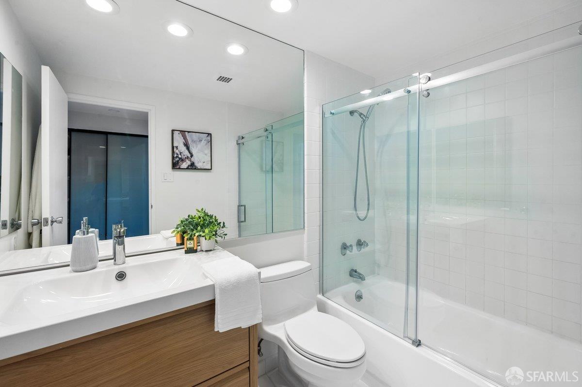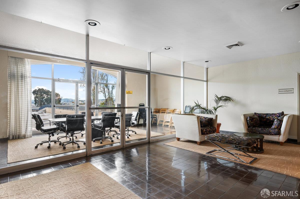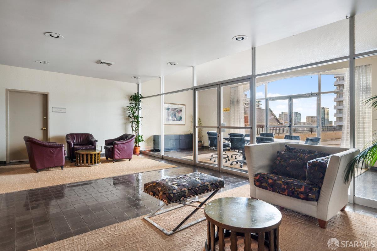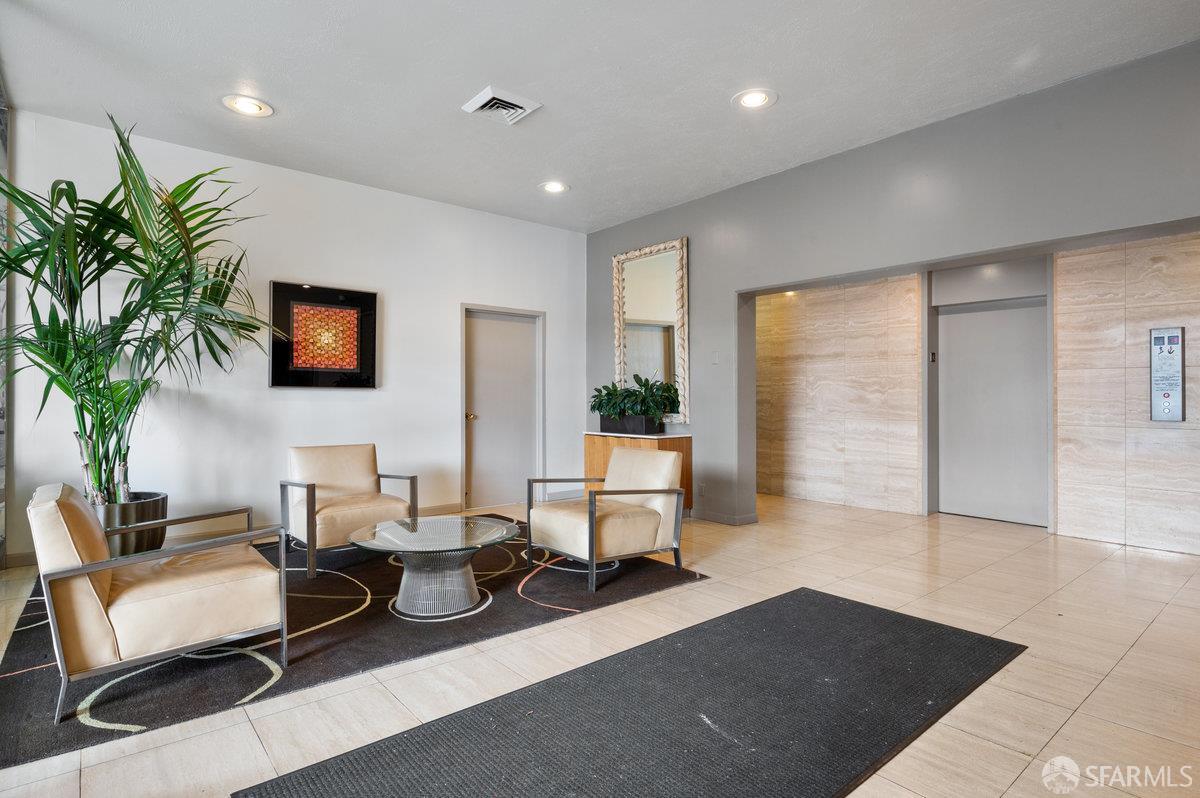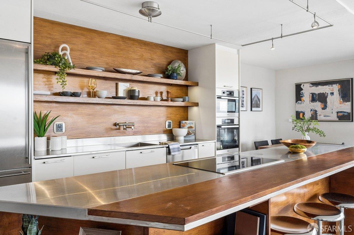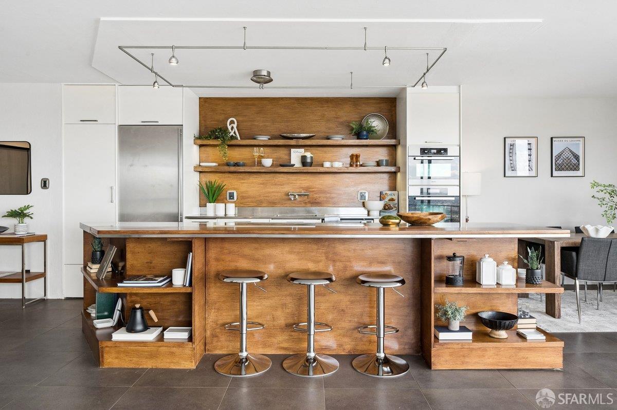 Residence 23D at Cathedral Hill Tower offers sweeping views of the Bay and the downtown skyline, from City Hall to Twin Peaks. Floor-to-ceiling windows fill the home with natural light, while a wraparound balcony provides a seamless indoor-outdoor experience with dramatic city vistas. This spacious one-bedroom, one-bath condo spans approximately 900 square feet - larger than most one-bedroom layouts - featuring an open living and dining area designed for both comfort and entertaining. The updated kitchen showcases a sleek, modern design with stainless steel appliances including Bosch Induction Cooktop and double Miele ovens, a large island with a custom wood-and-steel countertop, and a warm wood-accented backsplash. The generously sized bedroom accommodates a king bed, additional furniture, and workspace, and features multiple closets for ample storage. The updated bathroom includes a modern vanity and a shower over a tub with sliding glass doors. Additional highlights include one-car parking in a secured monitored garage, storage, 24-hour security and concierge, guest parking, shared EV charging, 2 elevators and 2 concrete staircases. Ideally located with a Walk Score of 98 near Hayes Valley, Japantown, and Lower Pacific Heights, with convenient access to transit and major routes.