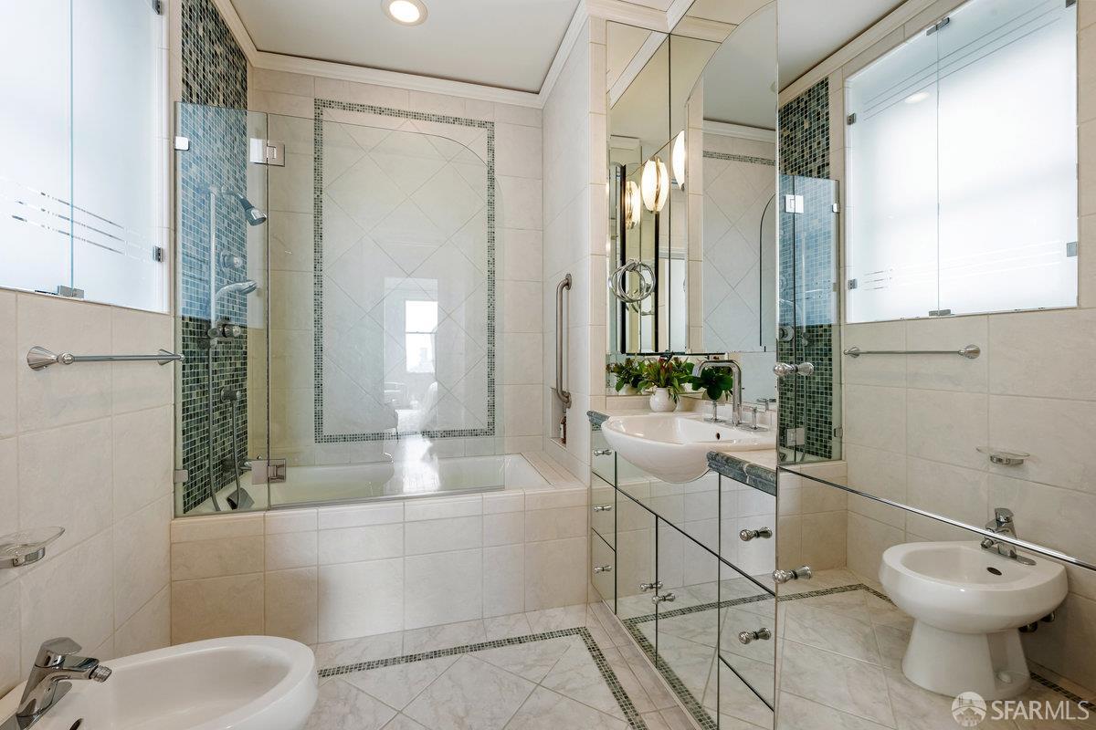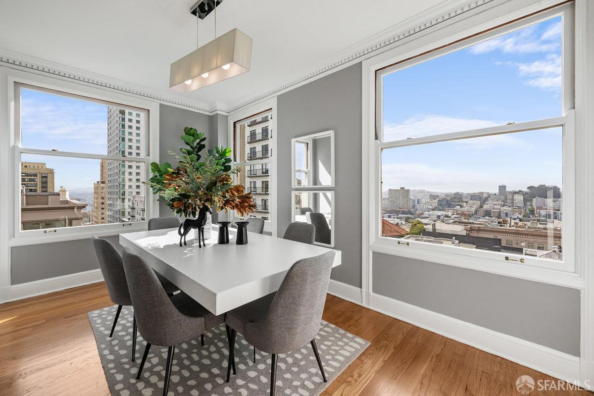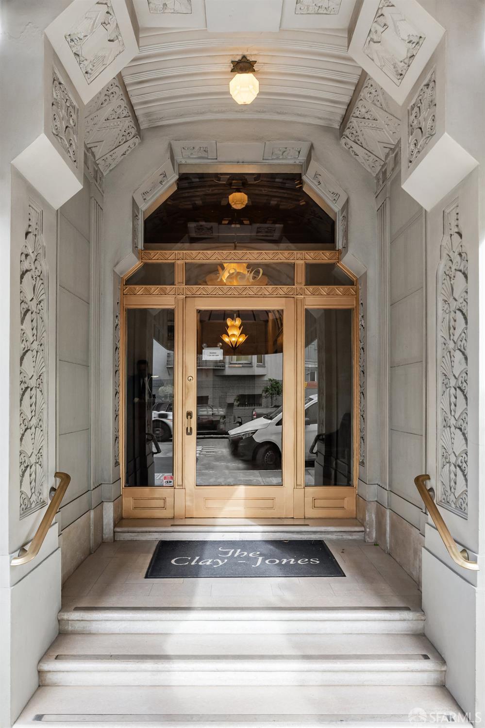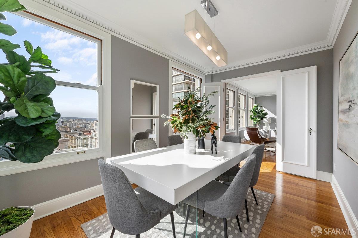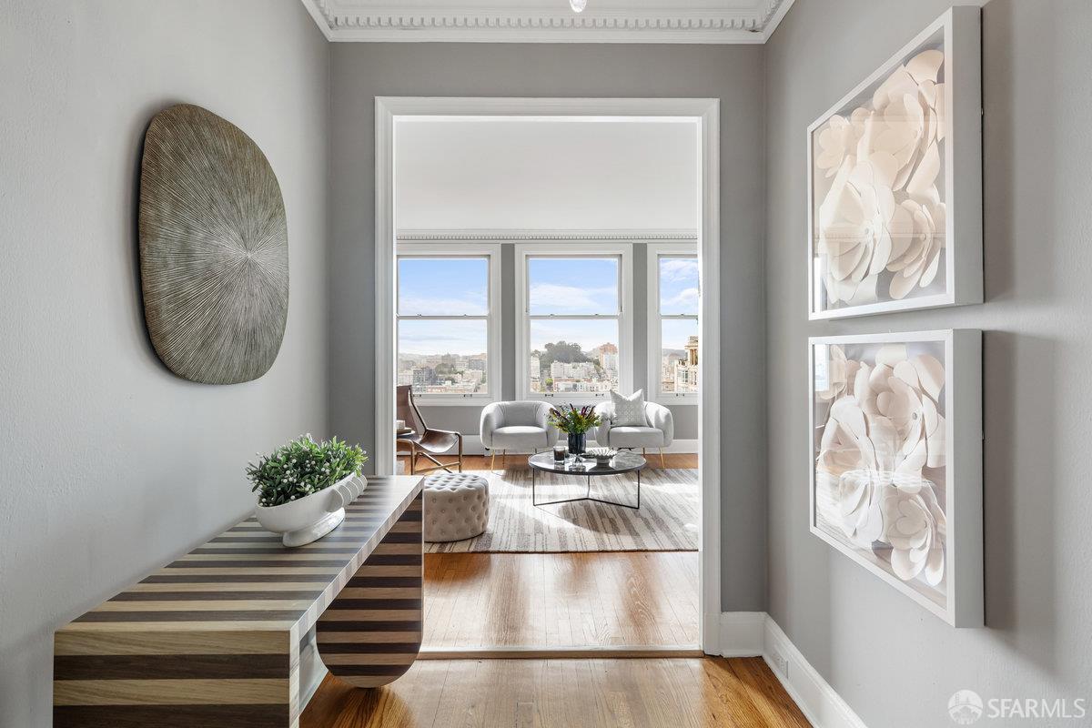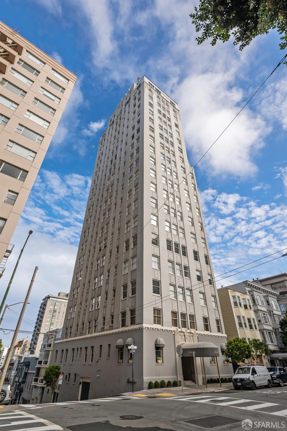 Perched atop Nob Hill in San Francisco's iconic Art Deco landmark, this 1,250 sq. ft. corner home blends timeless elegance with thoughtful modern upgrades. A reimagined floor plan with two full baths rare in the building and windows on three sides fills the interiors with light and sweeping views toward Pacific Heights, the Presidio, and the San Francisco skyline. The entry foyer, illuminated by Murano glass lighting, opens to gracious living and dining spaces with crown molding, hardwood floors, and classic craftsmanship. The chef's kitchen features natural stone counters, mill-grade cabinetry, pantry storage, and premium Bosch appliances with dual sinks. The primary suite enjoys a corner orientation, peek Bay views, generous storage, and an artisan-tiled en-suite bath with a multi-fixture tub and shower. A second full bath stuns with mosaic detail, while in-unit laundry enhances convenience. Building amenities include 24/7 door person service, private storage, a residents-only patio, and a large parking space that fits 1+ cars.