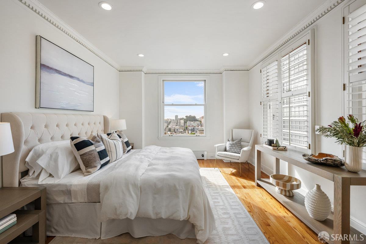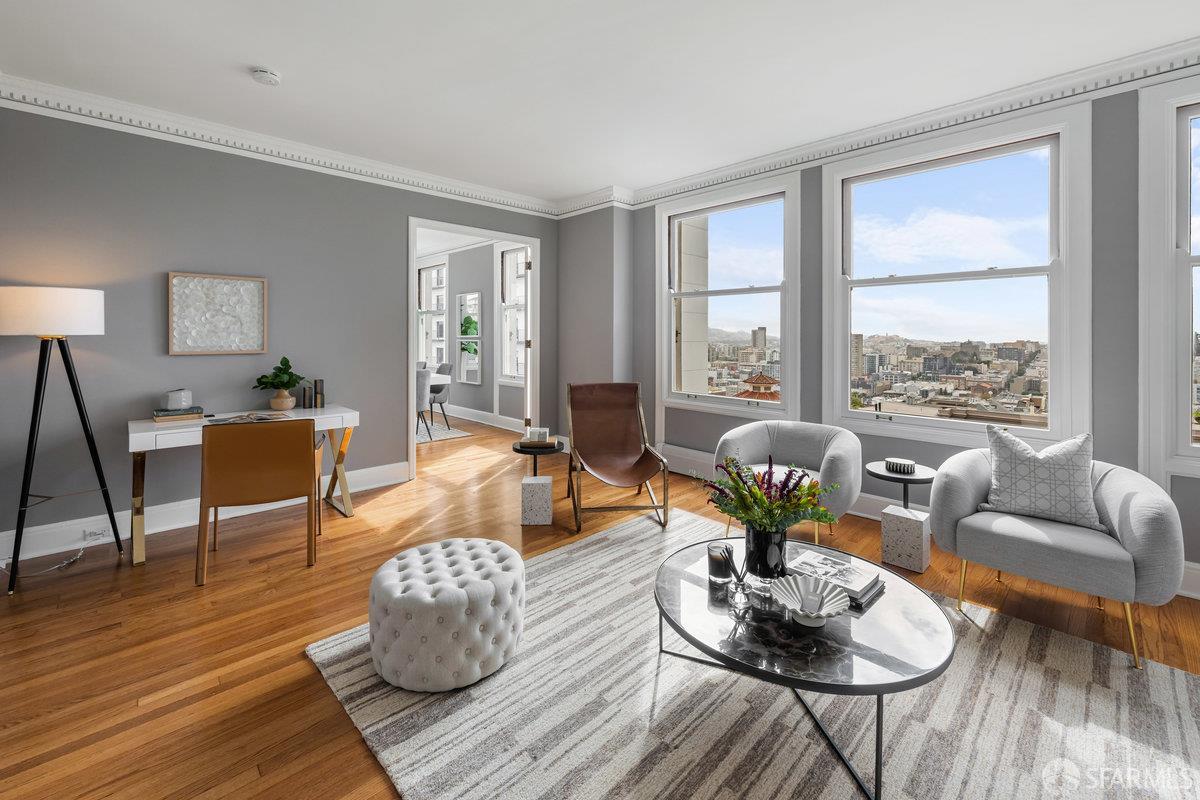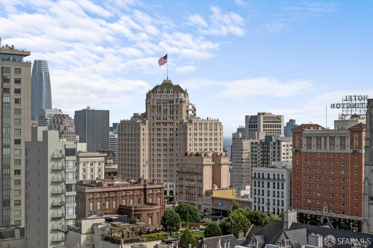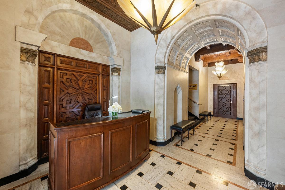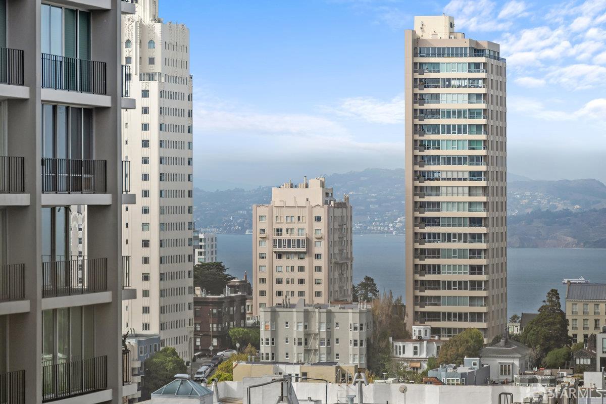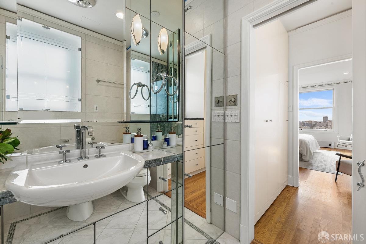 Perched atop Nob Hill in San Francisco's iconic Art Deco landmark, this 1,250 sq. ft. corner home blends timeless elegance with thoughtful modern upgrades. A reimagined floor plan with two full baths rare in the building and windows on three sides fills the interiors with light and sweeping views toward Pacific Heights, the Presidio, and the San Francisco skyline. The entry foyer, illuminated by Murano glass lighting, opens to gracious living and dining spaces with crown molding, hardwood floors, and classic craftsmanship. The chef's kitchen features natural stone counters, mill-grade cabinetry, pantry storage, and premium Bosch appliances with dual sinks. The primary suite enjoys a corner orientation, peek Bay views, generous storage, and an artisan-tiled en-suite bath with a multi-fixture tub and shower. A second full bath stuns with mosaic detail, while in-unit laundry enhances convenience. Building amenities include 24/7 door person service, private storage, a residents-only patio, and a large parking space that fits 1+ cars.