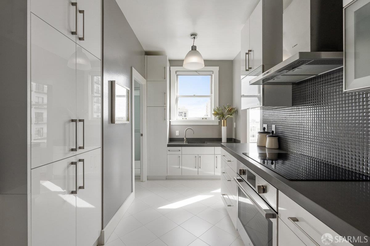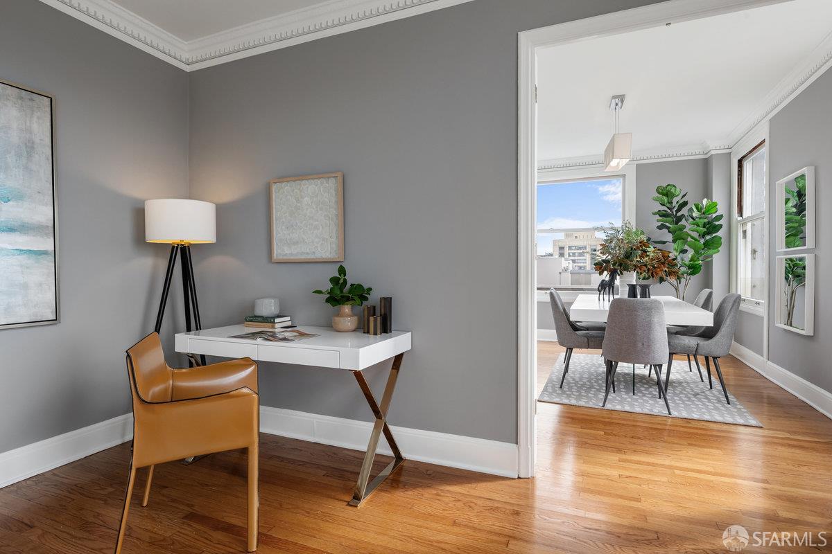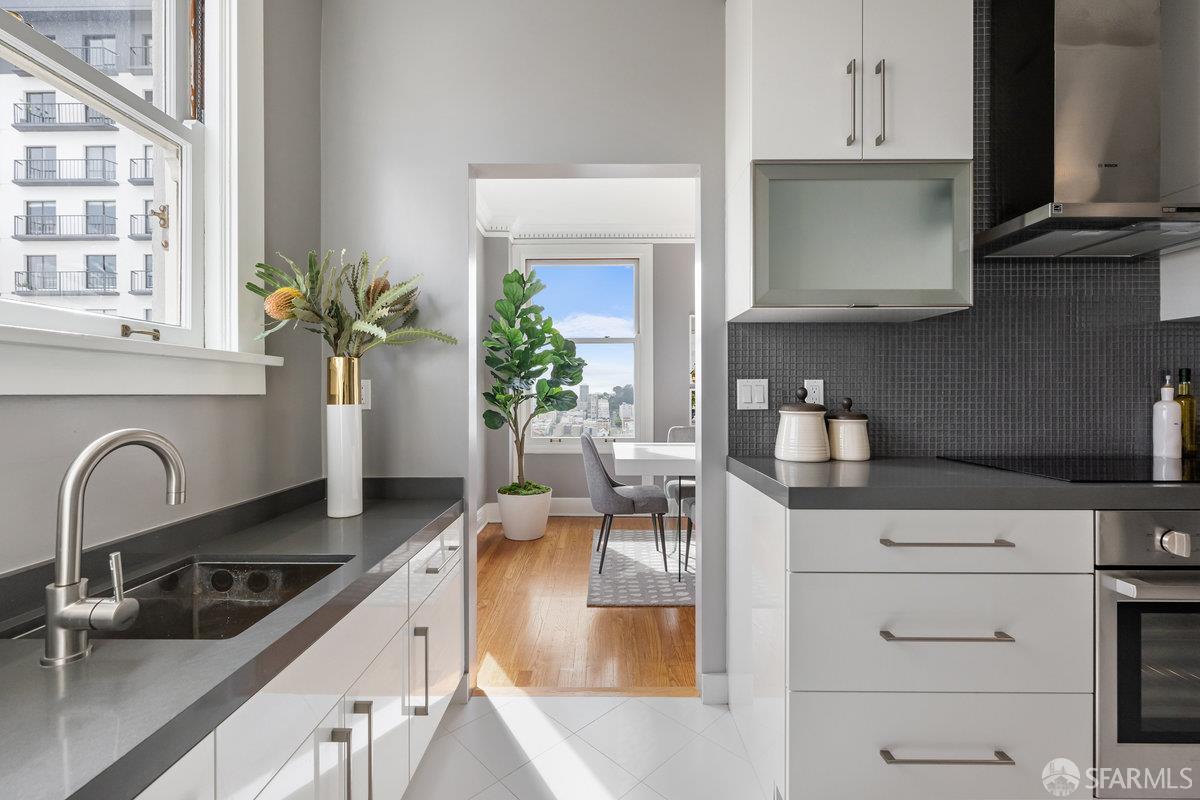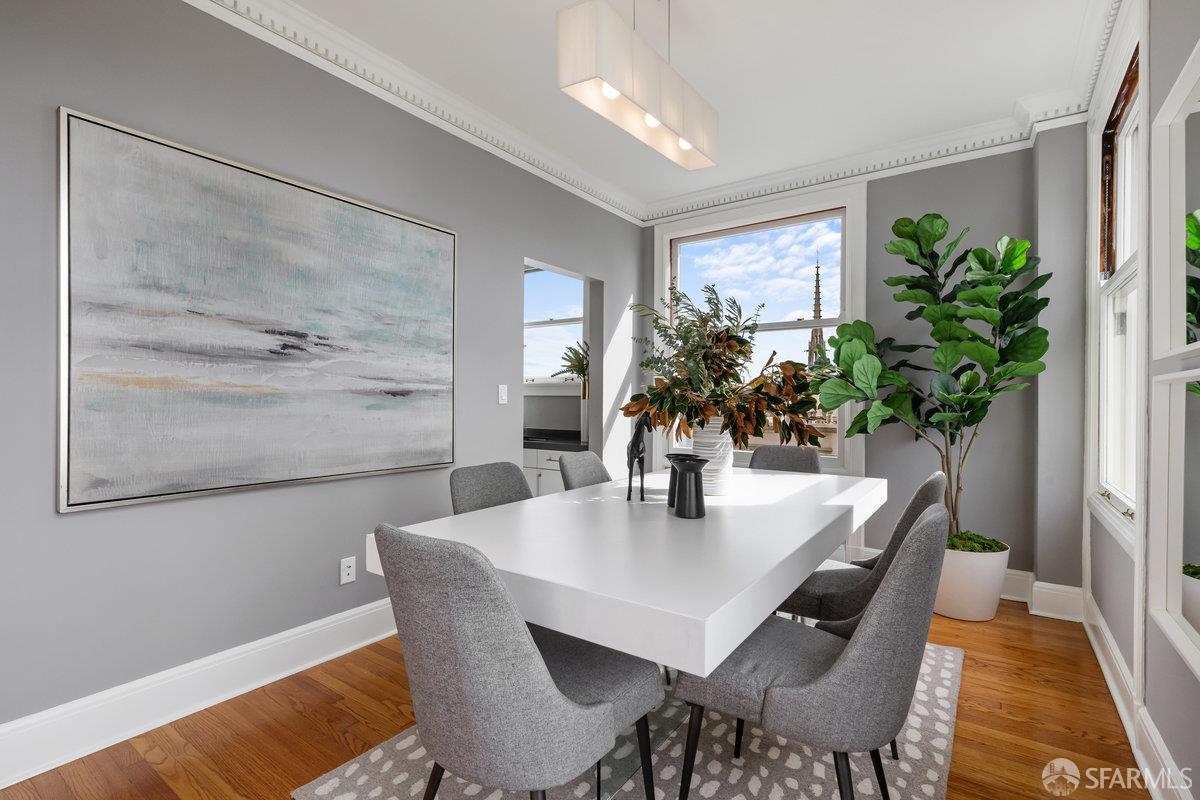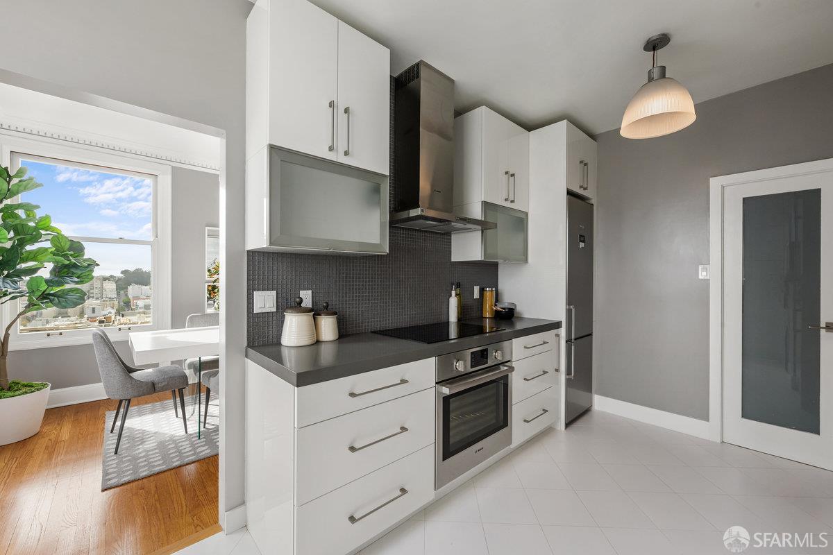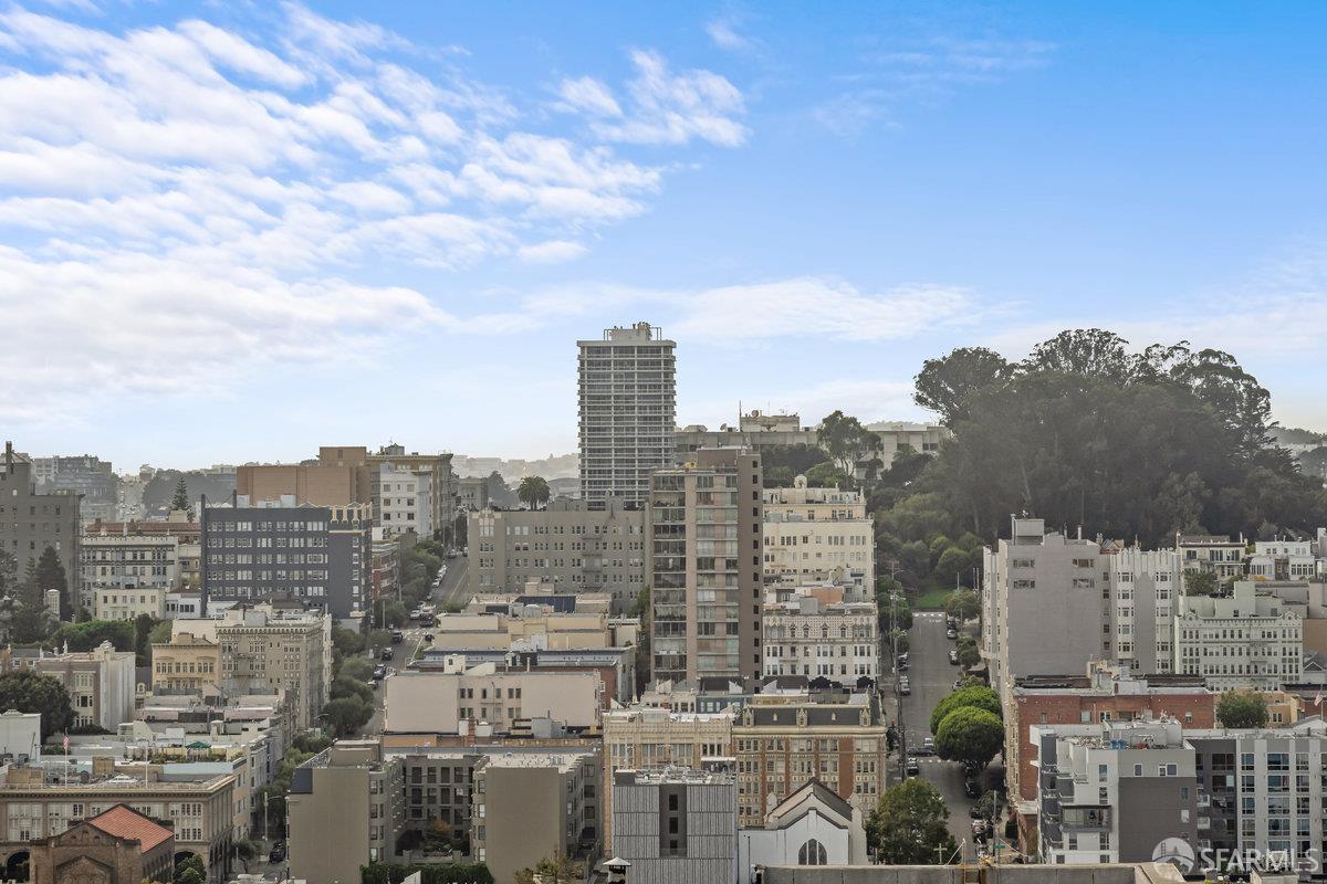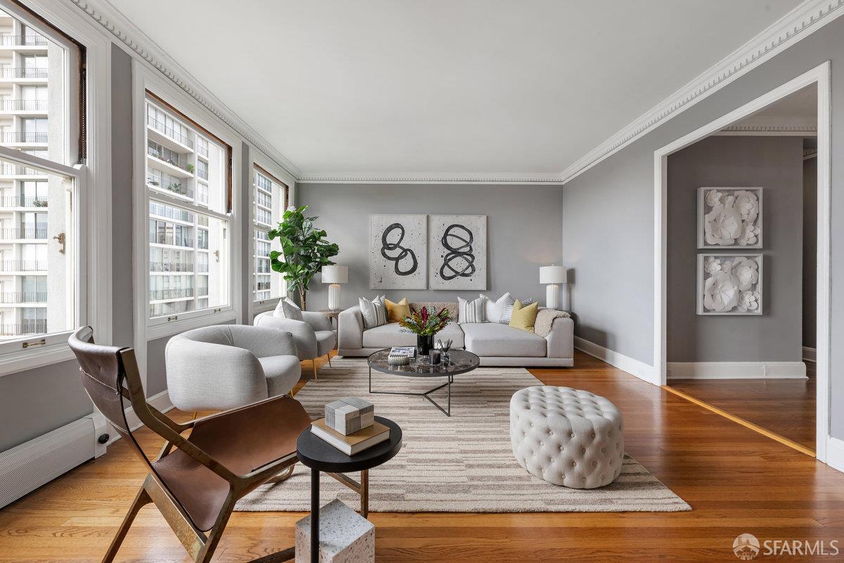 Perched atop Nob Hill in San Francisco's iconic Art Deco landmark, this 1,250 sq. ft. corner home blends timeless elegance with thoughtful modern upgrades. A reimagined floor plan with two full baths rare in the building and windows on three sides fills the interiors with light and sweeping views toward Pacific Heights, the Presidio, and the San Francisco skyline. The entry foyer, illuminated by Murano glass lighting, opens to gracious living and dining spaces with crown molding, hardwood floors, and classic craftsmanship. The chef's kitchen features natural stone counters, mill-grade cabinetry, pantry storage, and premium Bosch appliances with dual sinks. The primary suite enjoys a corner orientation, peek Bay views, generous storage, and an artisan-tiled en-suite bath with a multi-fixture tub and shower. A second full bath stuns with mosaic detail, while in-unit laundry enhances convenience. Building amenities include 24/7 door person service, private storage, a residents-only patio, and a large parking space that fits 1+ cars.