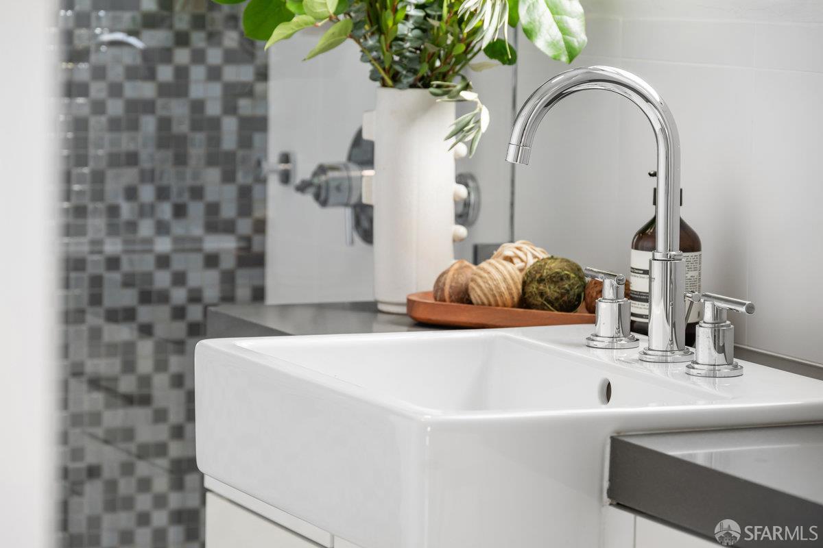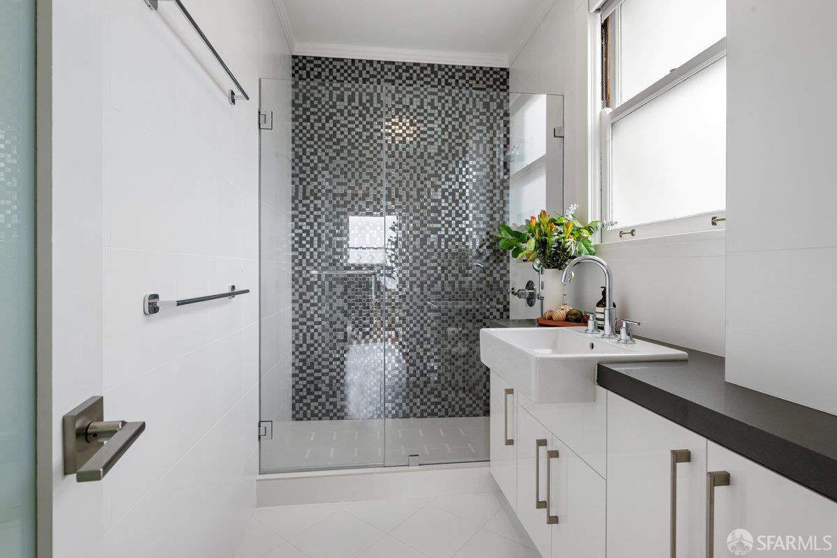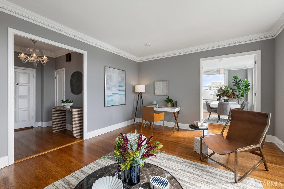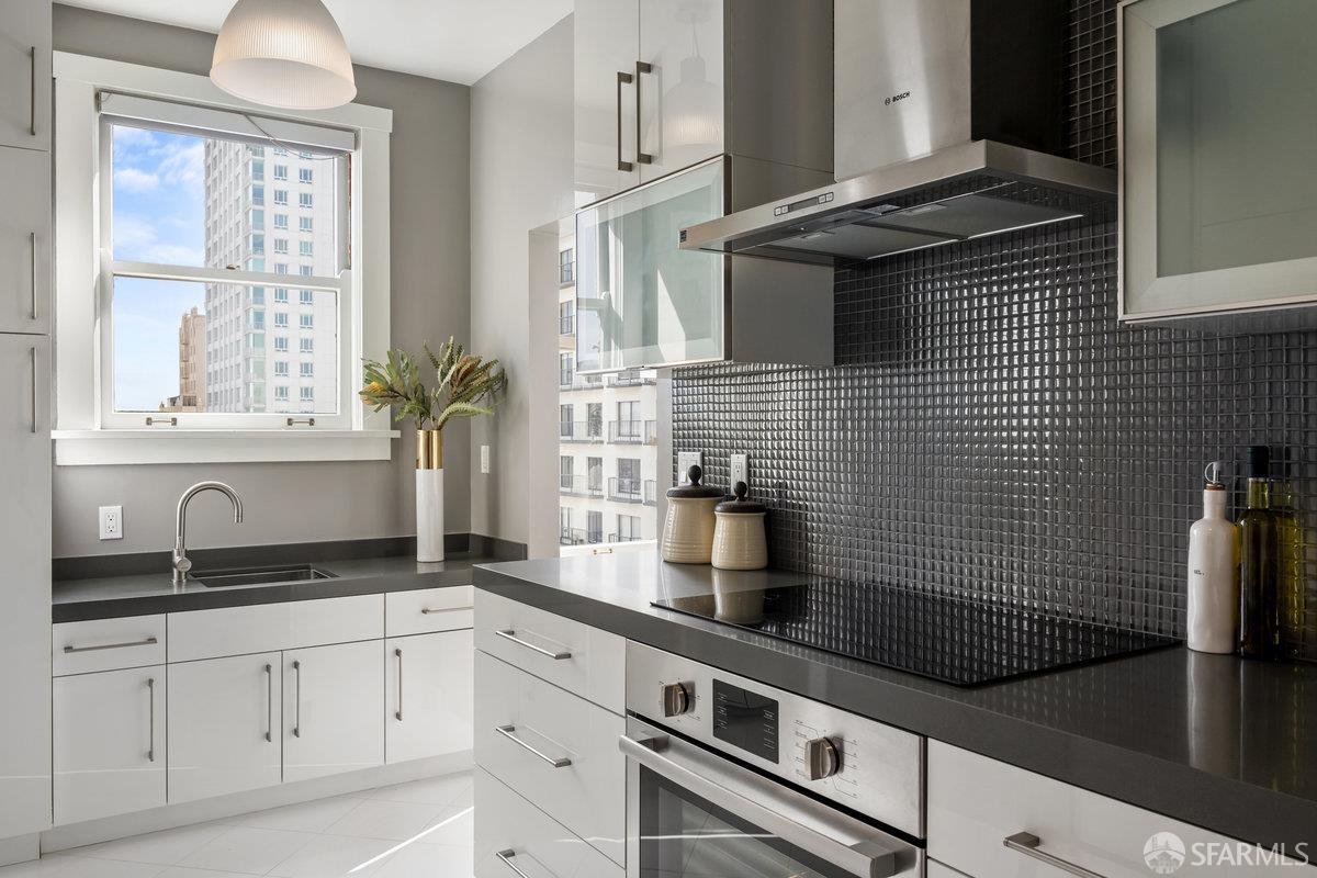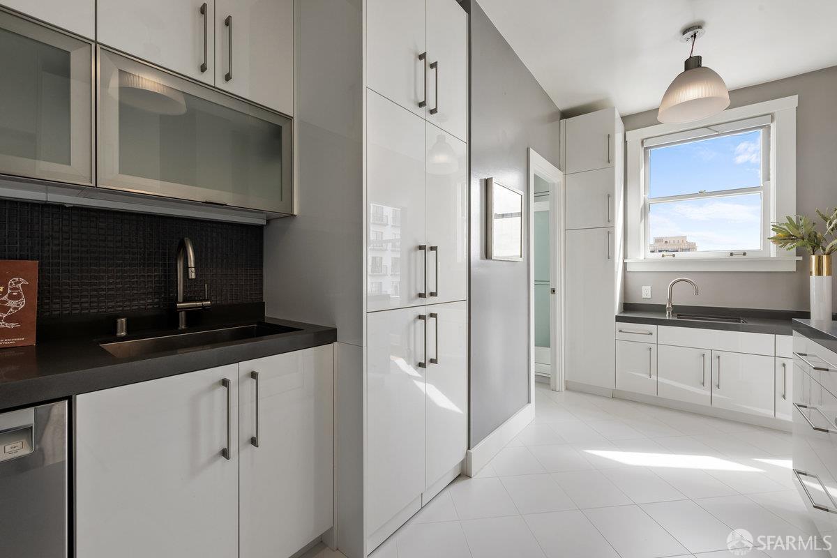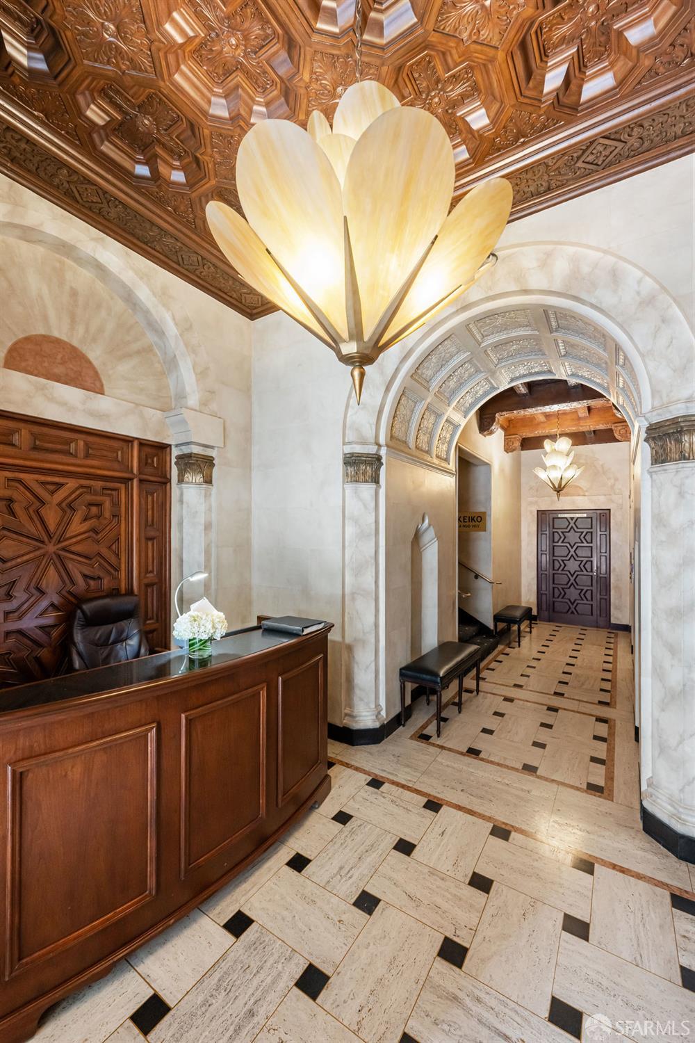 Perched atop Nob Hill in San Francisco's iconic Art Deco landmark, this 1,250 sq. ft. corner home blends timeless elegance with thoughtful modern upgrades. A reimagined floor plan with two full baths rare in the building and windows on three sides fills the interiors with light and sweeping views toward Pacific Heights, the Presidio, and the San Francisco skyline. The entry foyer, illuminated by Murano glass lighting, opens to gracious living and dining spaces with crown molding, hardwood floors, and classic craftsmanship. The chef's kitchen features natural stone counters, mill-grade cabinetry, pantry storage, and premium Bosch appliances with dual sinks. The primary suite enjoys a corner orientation, peek Bay views, generous storage, and an artisan-tiled en-suite bath with a multi-fixture tub and shower. A second full bath stuns with mosaic detail, while in-unit laundry enhances convenience. Building amenities include 24/7 door person service, private storage, a residents-only patio, and a large parking space that fits 1+ cars.