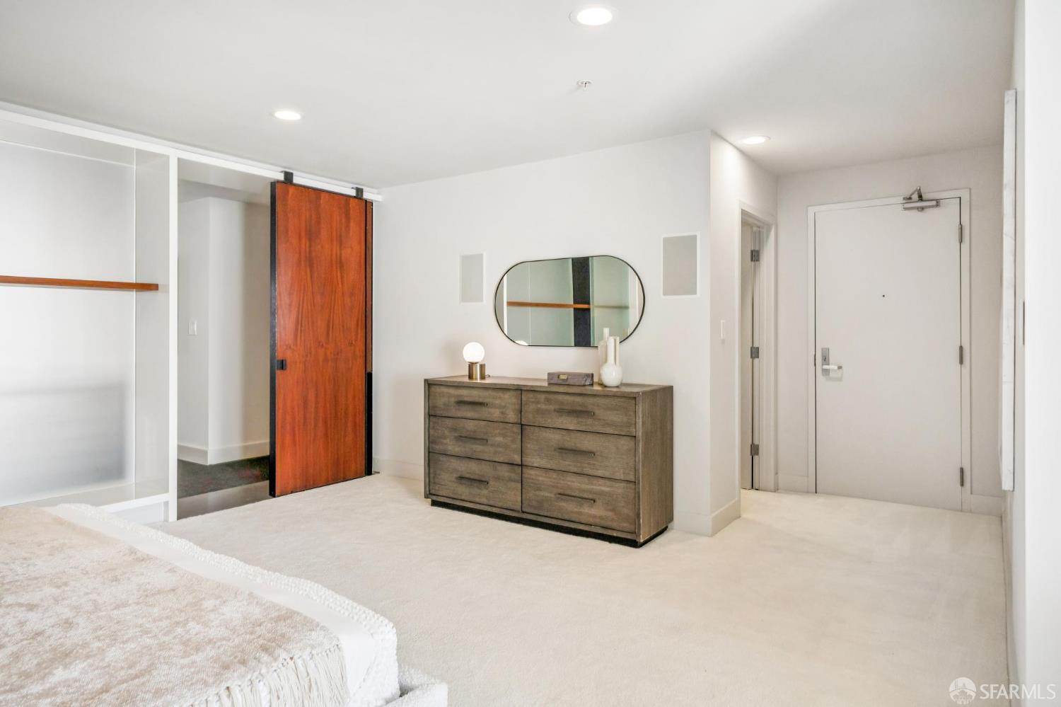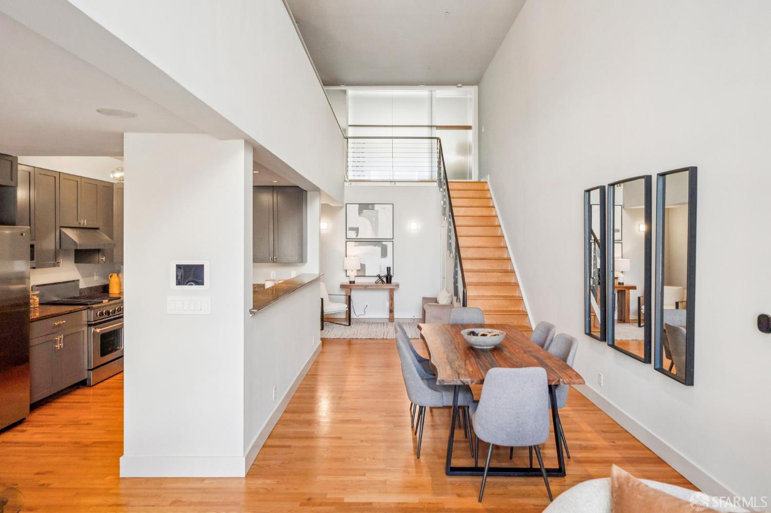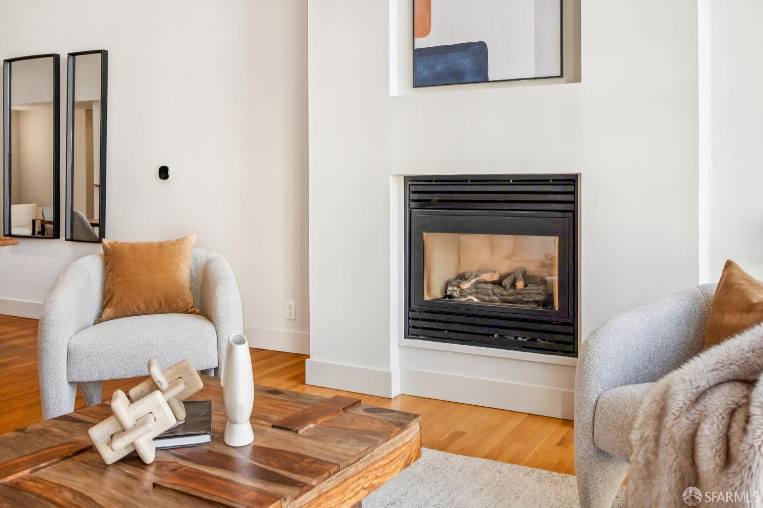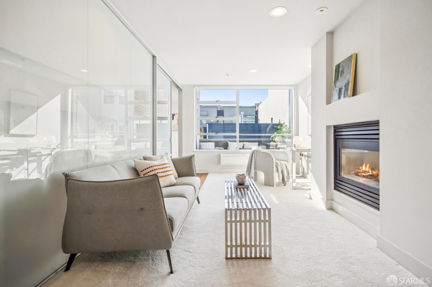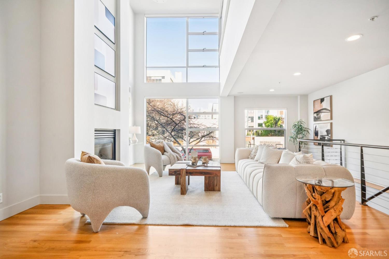 This expansive tri-level loft is truly one of a kind, offering approximately 2,597 square feet of thoughtfully designed living space. The dramatic main living level is anchored by a fireplace and framed by two stories of windows, creating an airy, light-filled setting. An updated kitchen and a versatile bonus lounge or seating area provide flexibility for both everyday living and entertaining. The residence features three bedrooms and two-and-a-half baths, complemented by modern upgrades including recessed speakers, with Sonos connectivity, automated window treatments, and beautifully appointed luxury bathrooms. The upper level is dedicated to two bedrooms. The primary suite, features a living area fireplace, air conditioning, large walk-in closet, and a spa-inspired bath with soaking tub and separate walk-in shower. A private terrace crowns the suite, offering an inviting outdoor retreat. A second bedroom features a wall of sliding panels that open the space, along with integrated media and sound. On the lower level, the third bedroom doubles perfectly as a home office, with direct street access. Each of the three levels enjoys its own independent entrance, enhancing privacy and flexibility. Set within a boutique six-unit live/work building, the home includes one-car parking, storage, and in-unit washer and dryer.