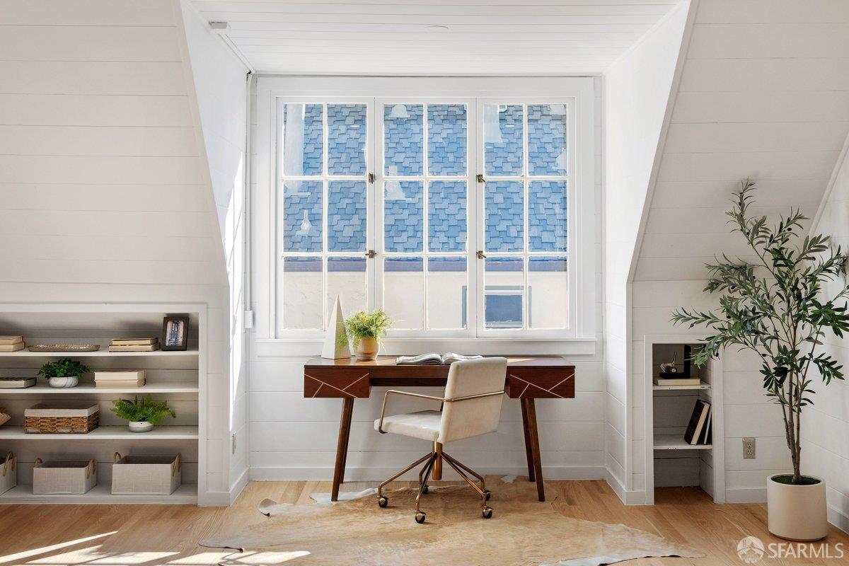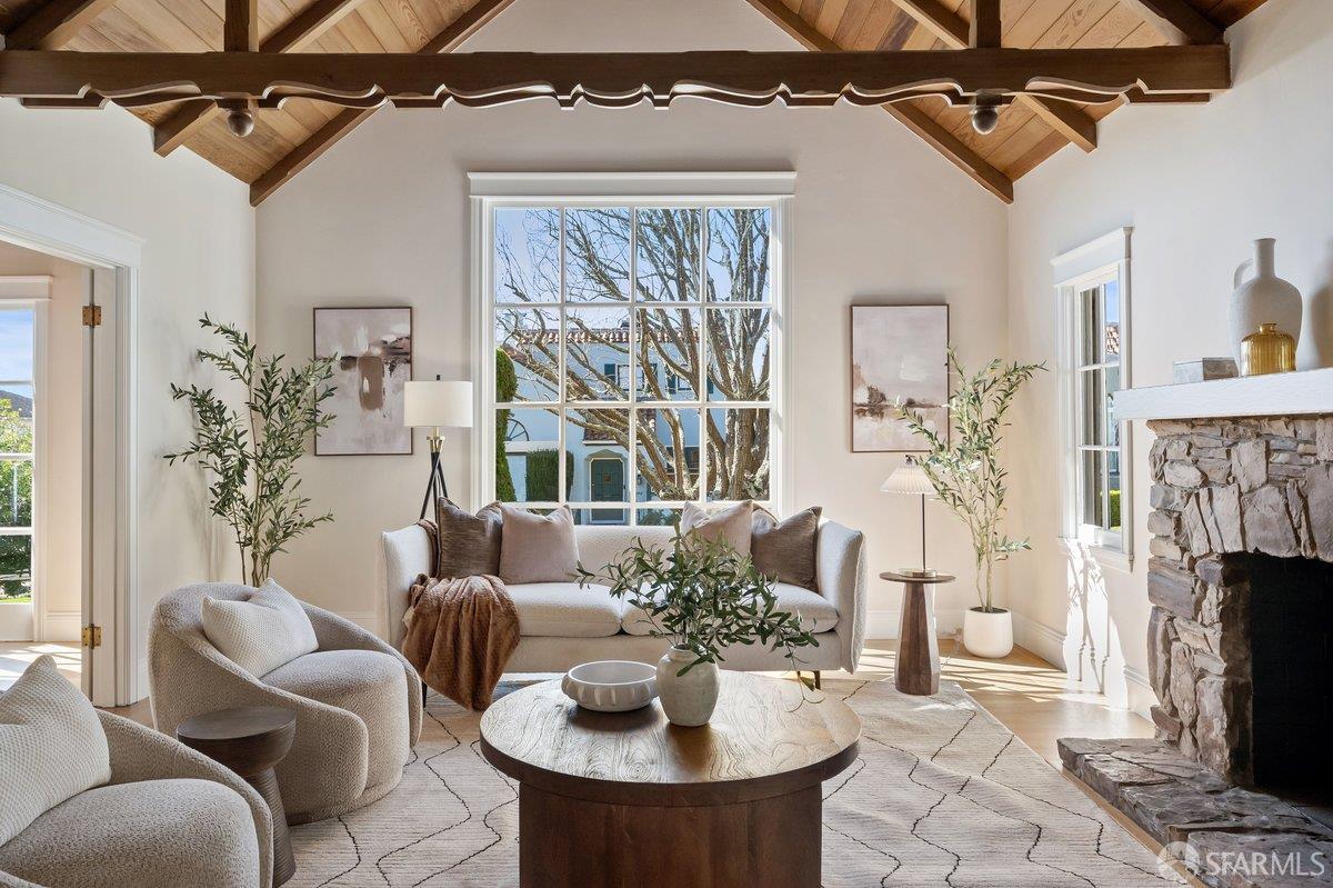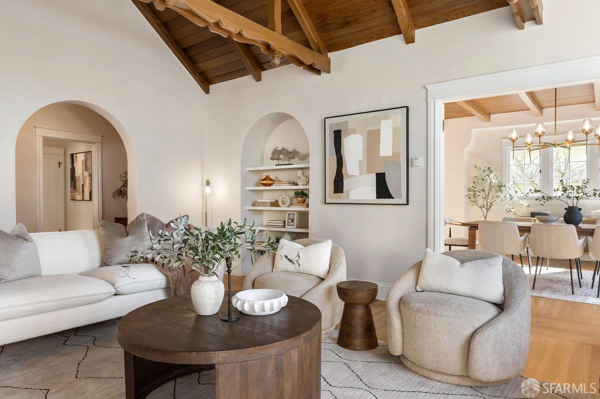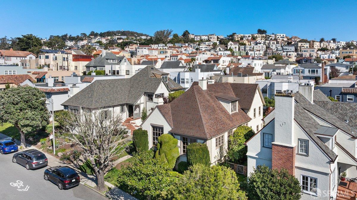 Grand heritage residence in the coveted Balboa Terrace offering scale, character, and exceptional frontage on a beautiful tree-lined street. Set on an oversized 5,397 sq ft lot with an impressive 51-foot frontage, this stately single-family home spans over 2,500 sq ft and showcases timeless architectural charm throughout. A gracious entry foyer leads to the dramatic living room featuring a soaring vaulted open-beam ceiling with decorative wood trusses, expansive window lines, hardwood floors, and a classic fireplace that anchors the space. A formal dining room provides an elegant setting for gatherings, while the supersized kitchen includes a gas range, breakfast area, and generous space for everyday living. The flexible floor plan offers four bedrooms and three full baths, including a main-level ensuite bedroom ideal for guests or flexible living. The split upper level features two bedrooms and two baths, including one bedroom with a charming lofted play space. The top level presents a grand light-filled space that could be envisioned as a spacious primary suite, studio, or inspiring retreat. Completing the home is private rear parking with rare side-by-side two-car parking. Ideally located just blocks from West Portal Village, two neighborhood parks, and convenient transportation to Downtown San Francisco and the Peninsula, this Balboa Terrace gem presents a wonderful opportunity to personalize a classic San Francisco home with remarkable scale, frontage, and curb appeal.
