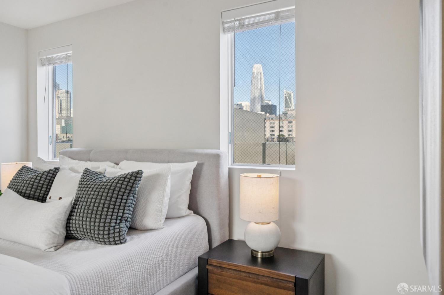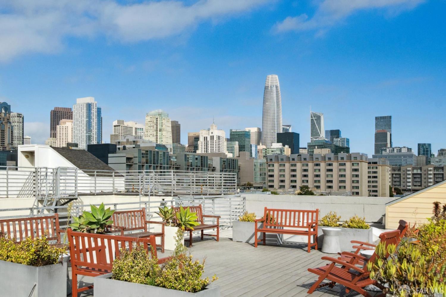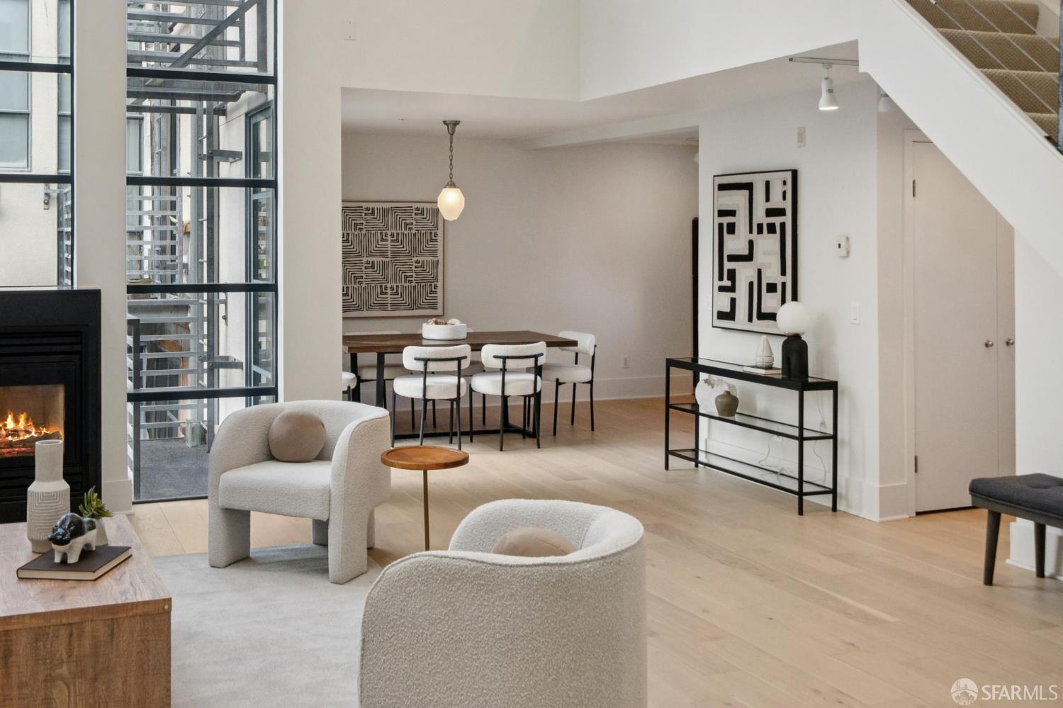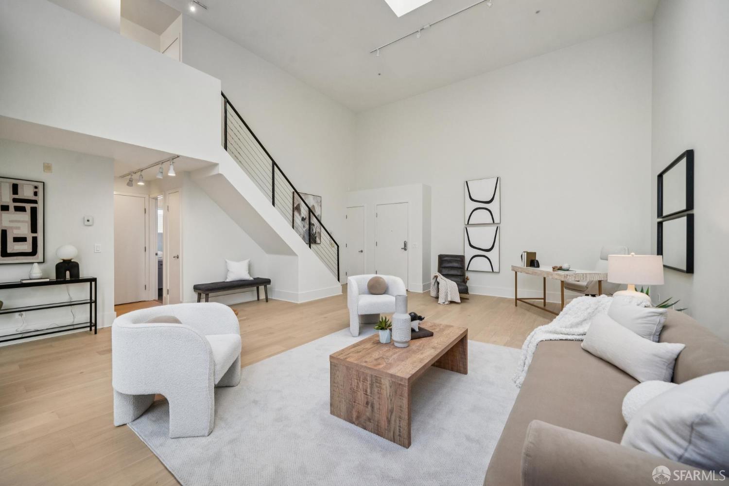 Step inside the top-floor corner residence at 920 Harrison Street, a spacious, light-filled home featuring 1bd/1.5BA, three sides of windows and a dramatic set of skylights. Recently renovated, the main level offers showcases new wide blank oak floors a large living room centered around a fireplace and framed by two stories of windows. An additional lounge area provides a perfect space for a home office. Just off the living and dining areas is a generous kitchen with city skyline outlooks. This level also includes three sizable closets, in-unit laundry, and a convenient powder room. As you ascend to the top floor, you'll be captivated by the enormous walk-in closet, comfortable lounge area, and spacious bedroom, complete with windows on both sides. This home includes deeded parking and additional storage. One flight above the home is roof deck with all incredible skyline views. Perfectly located at 5th Street and Harrison Street. Convenience is key, with easy access to the freeway, Caltrain, the new MUNI Central Subway, shops, restaurants, and entertainment.