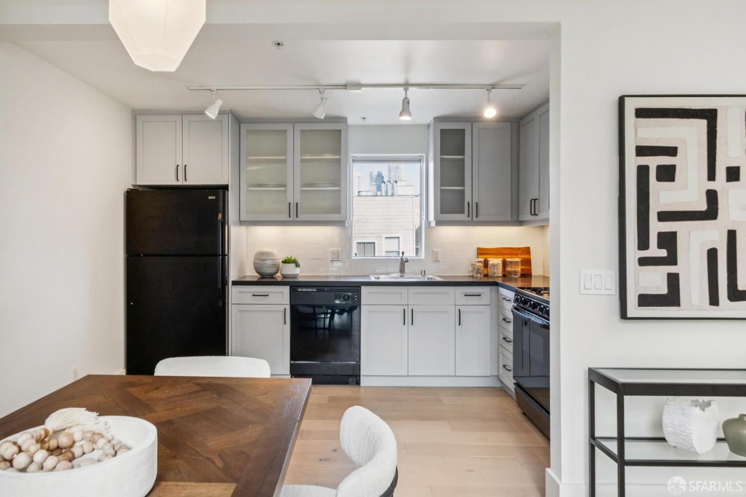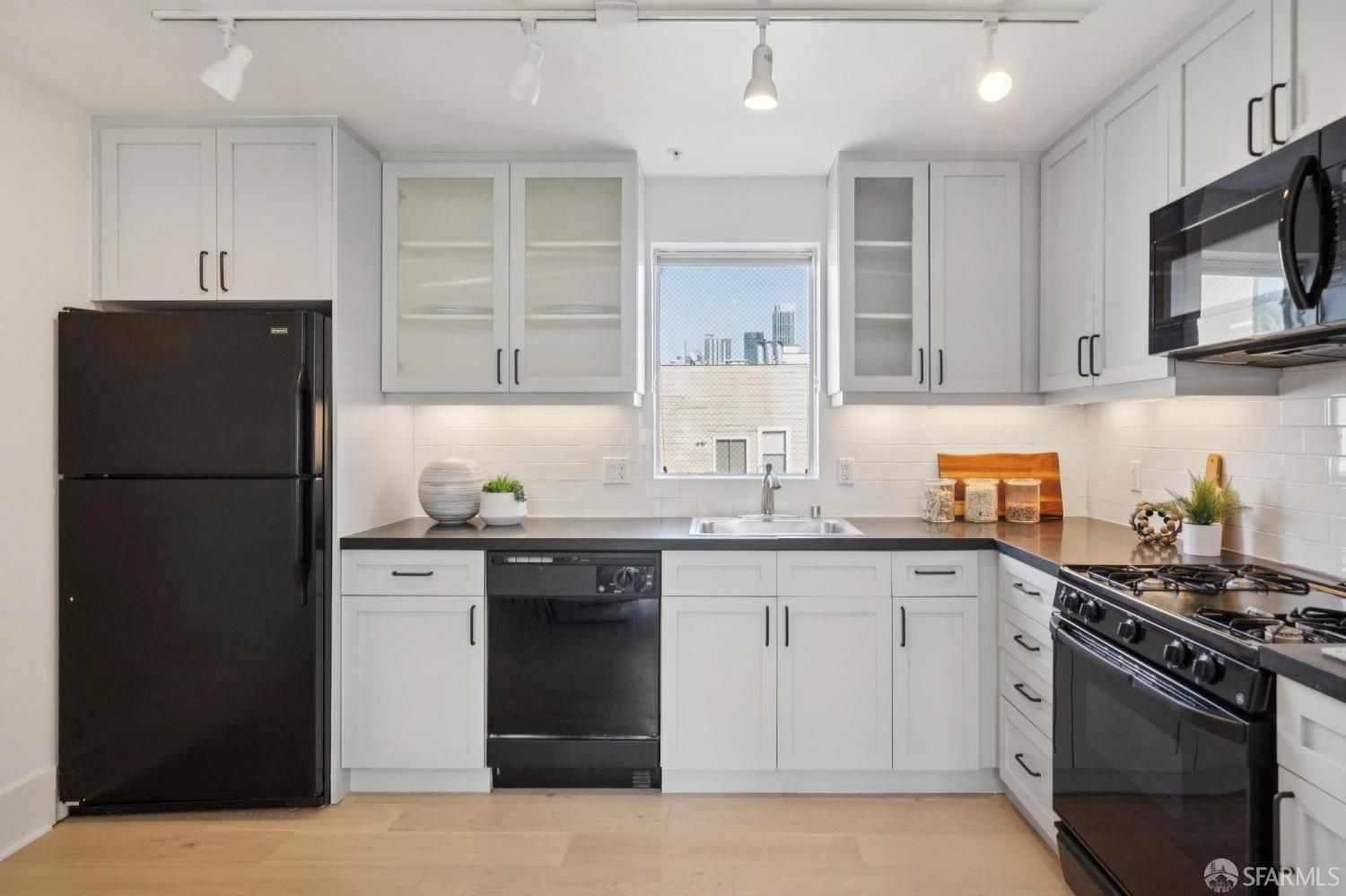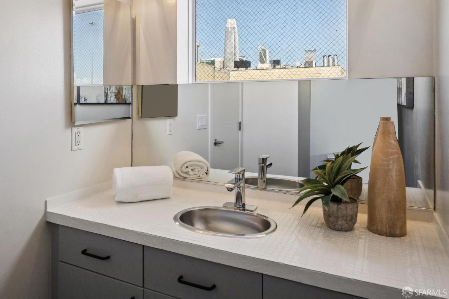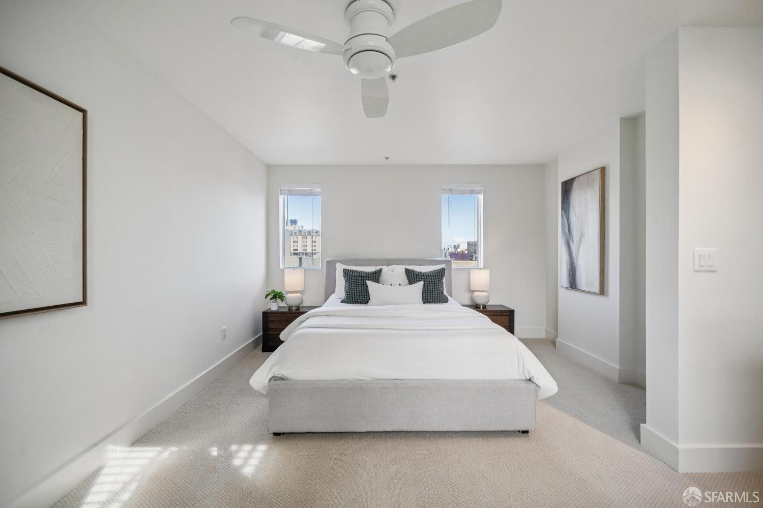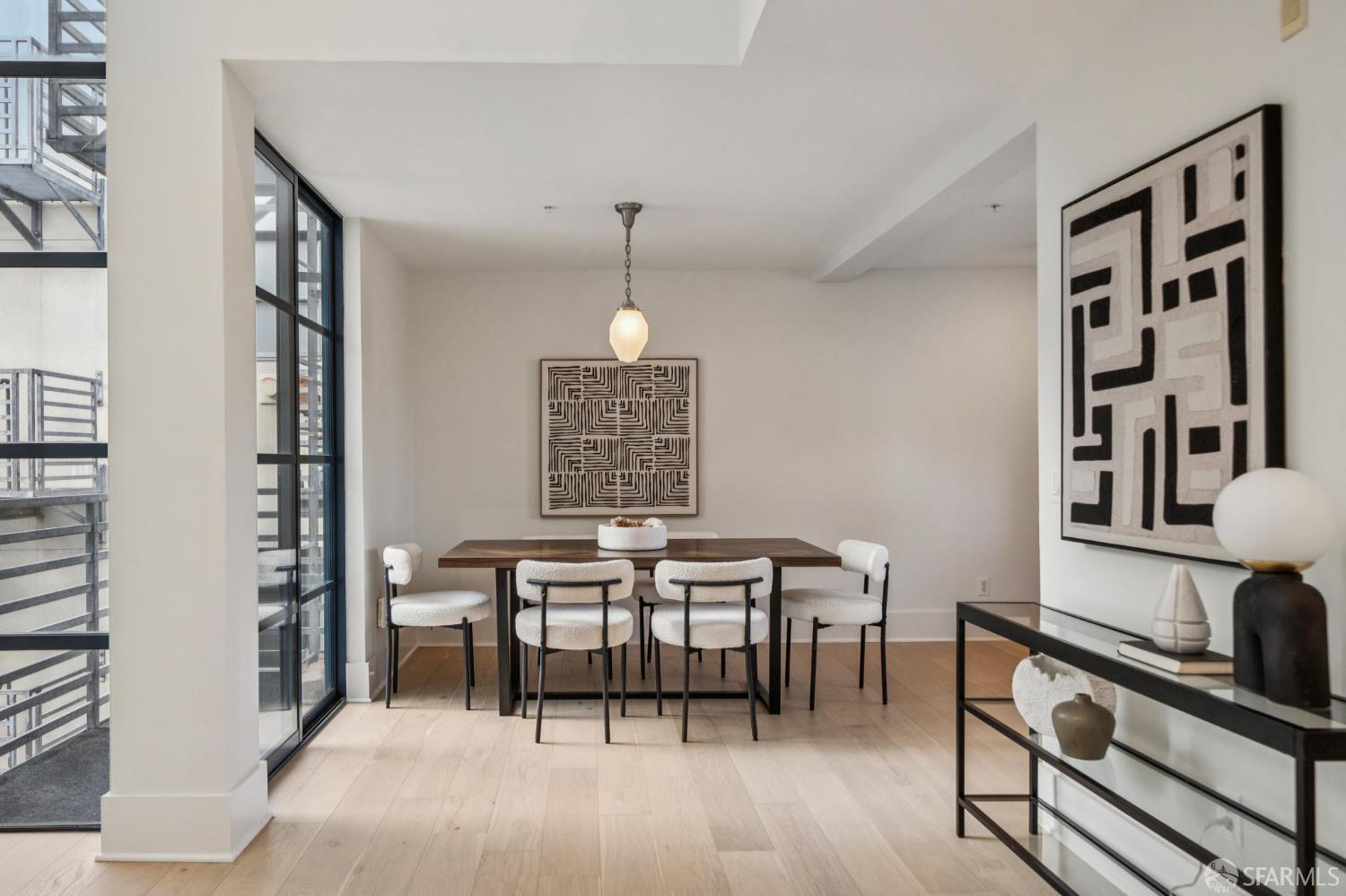 Step inside the top-floor corner residence at 920 Harrison Street, a spacious, light-filled home featuring 1bd/1.5BA, three sides of windows and a dramatic set of skylights. Recently renovated, the main level offers showcases new wide blank oak floors a large living room centered around a fireplace and framed by two stories of windows. An additional lounge area provides a perfect space for a home office. Just off the living and dining areas is a generous kitchen with city skyline outlooks. This level also includes three sizable closets, in-unit laundry, and a convenient powder room. As you ascend to the top floor, you'll be captivated by the enormous walk-in closet, comfortable lounge area, and spacious bedroom, complete with windows on both sides. This home includes deeded parking and additional storage. One flight above the home is roof deck with all incredible skyline views. Perfectly located at 5th Street and Harrison Street. Convenience is key, with easy access to the freeway, Caltrain, the new MUNI Central Subway, shops, restaurants, and entertainment.